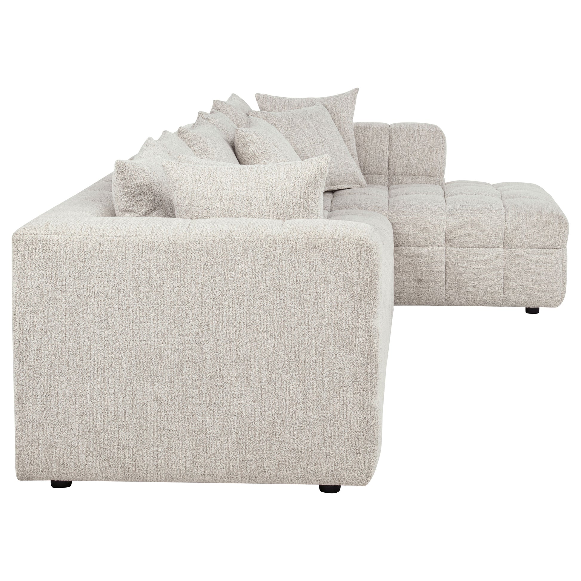 Sectional sofa creates a relaxed corner lounge with a low-profile silhouette, track arms, and tailored channel tufting suited to contemporary spaces. Soft fabric upholstery covers foam cushioning with polyester fiber support over a pine and plywood frame with wood reinforcement. The modular design helps you shape open living rooms, dens, or lofts with flexible seating that feels cohesive. Use it to anchor conversation areas, stretch out after long days, and keep everyday lounging comfortable and organized.