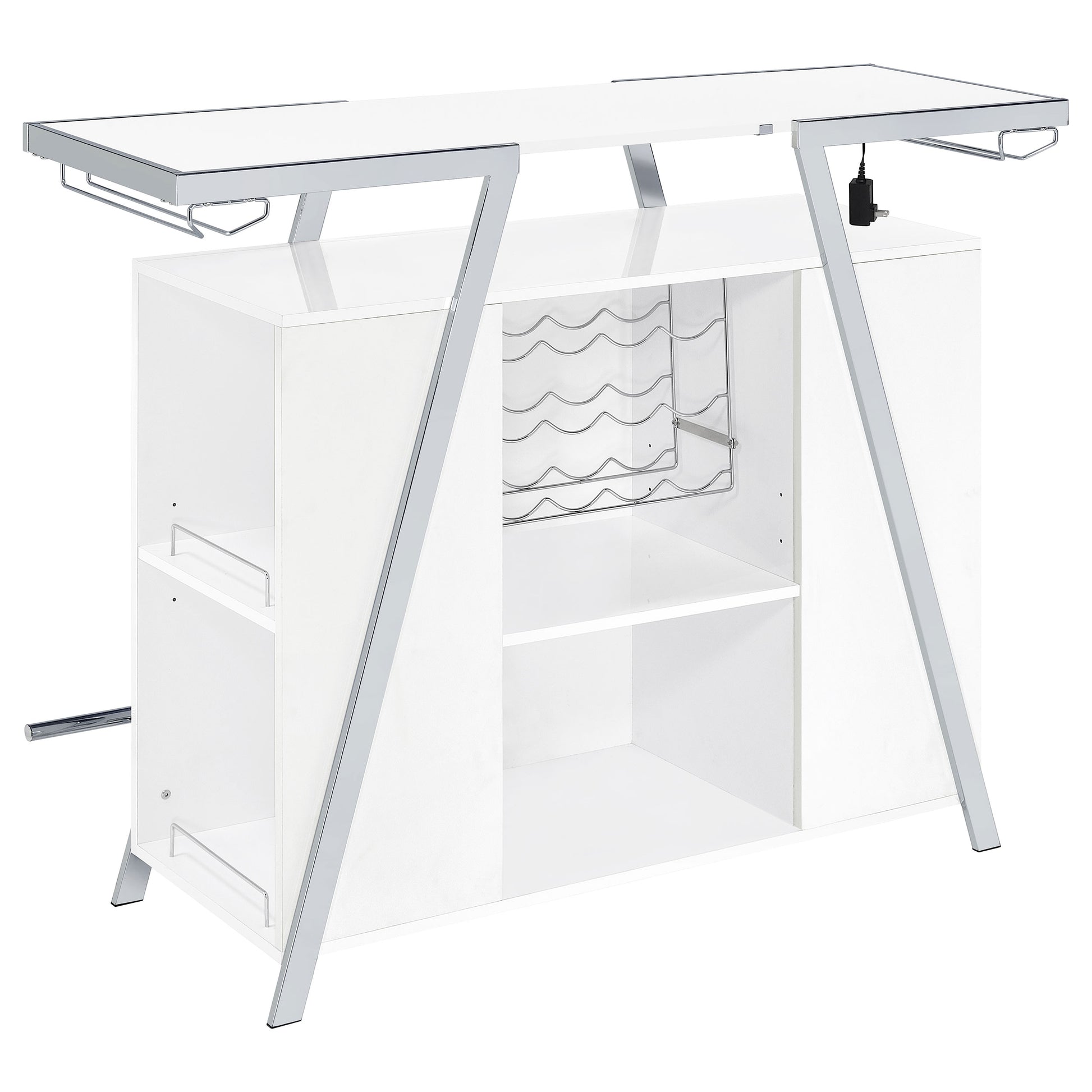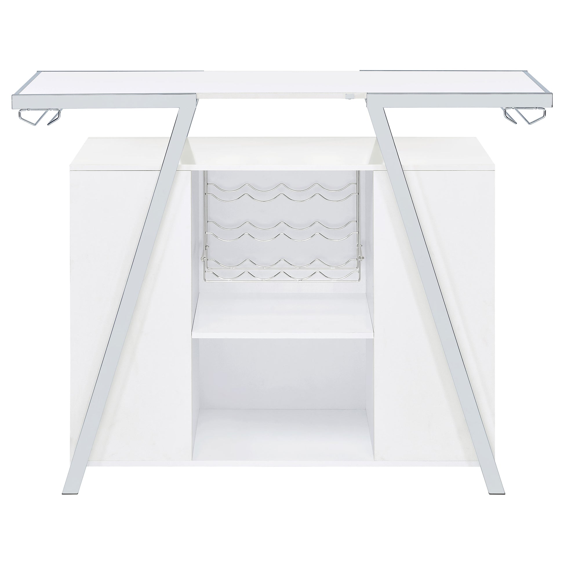 Pull out all the stops to breathe fresh energy and organization into a casual space dedicated to entertainment. Your needs are met with this modular-inspired and contemporary home bar constructed of MDF, paper coating, and veneer, all with a bright white finish. Metal framing is jazzy with a geometric motif, supporting a spacious top shelf ideal for beverage and snack prep. A center compartment features shelving and bottle racks, while the integrated LED strip located on the underside of the table top can change color. This handy bar unit transforms a compact space into a modern home-based venue for fun.