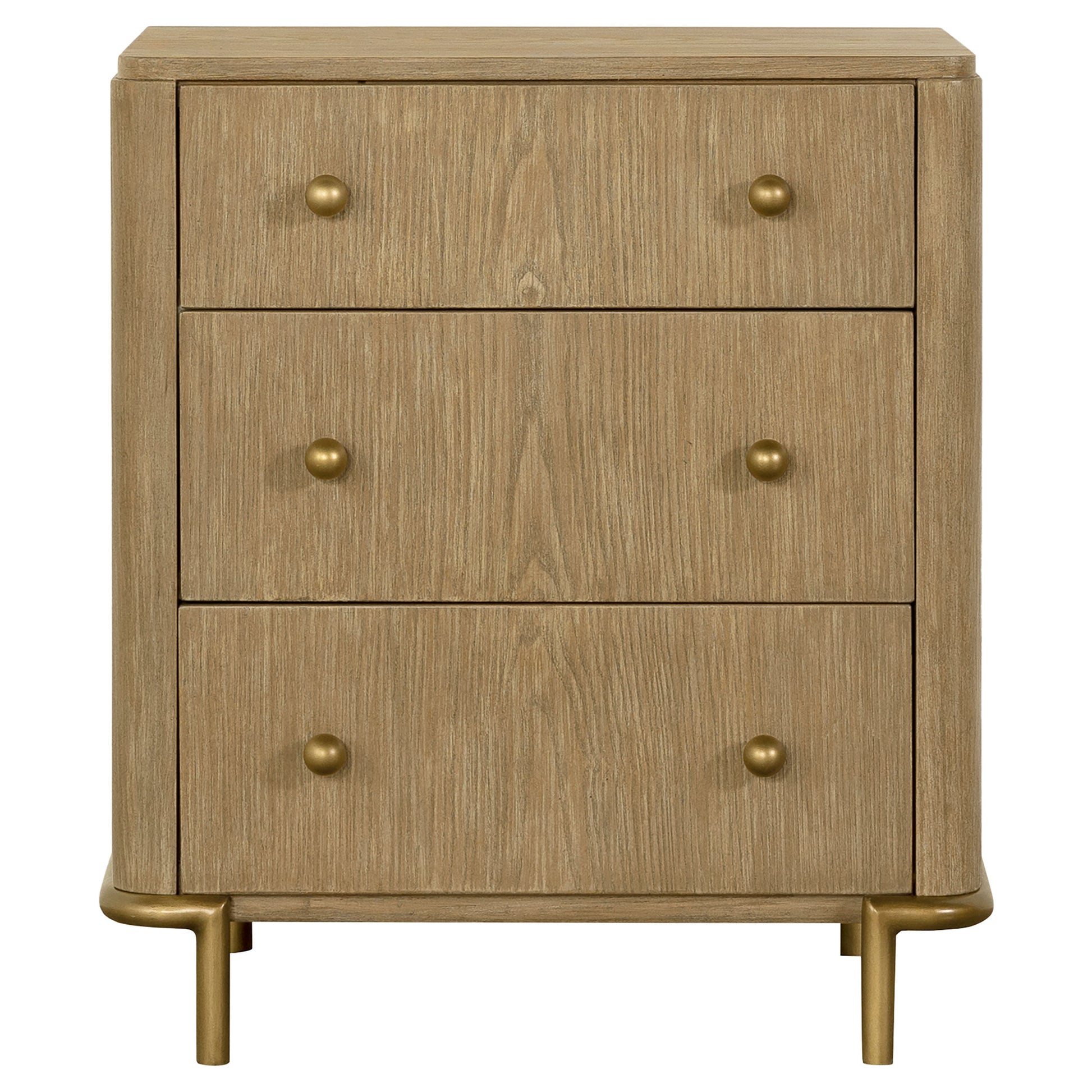 • Aged brass knobs and slender metal legs add a subtle touch of elegance