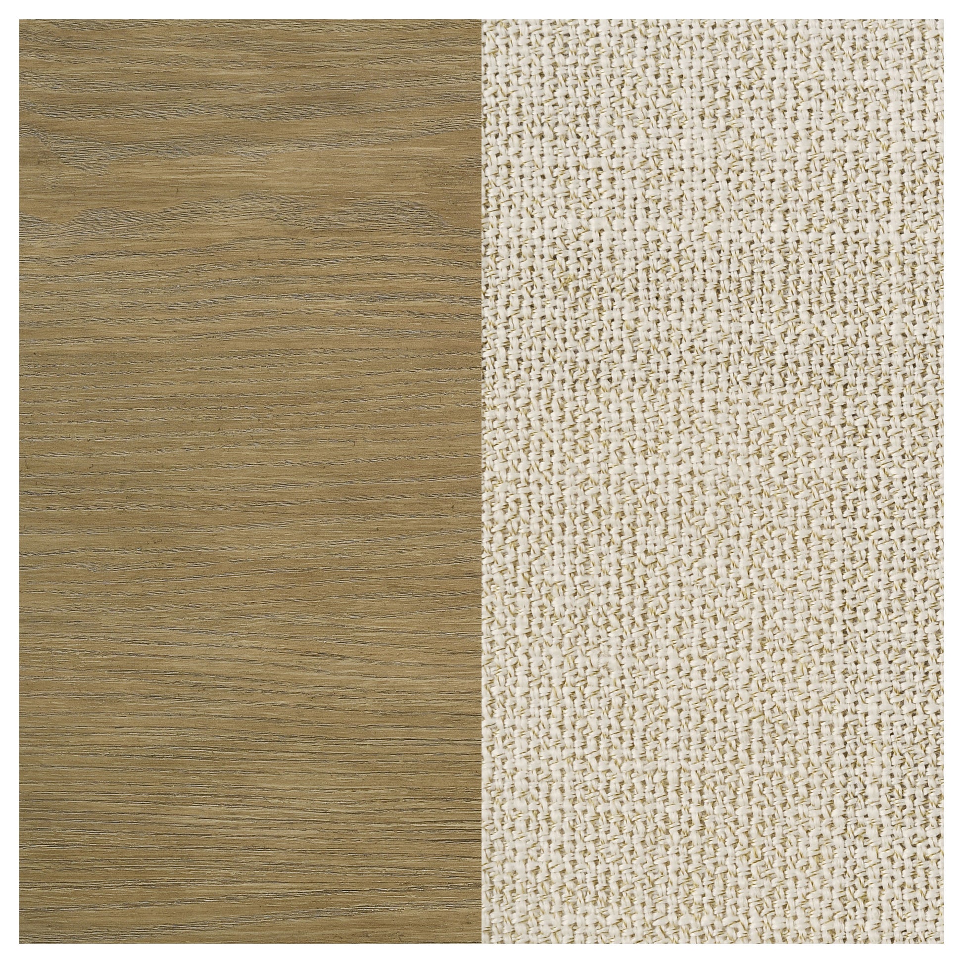 This coastal-inspired bedroom set blends mid-century modern influences with natural textures for a serene retreat. The bed features a cream fabric upholstered headboard and footboard, framed by a wire-brushed wood finish that enhances the beauty of rubberwood, engineered wood, and ash veneer. Aged brass knobs and slender metal legs provide a refined contrast. Designed for modern living, the nightstand includes a built-in dual USB charging port. With its organic textures and functional details, this set offers timeless style and everyday convenience.