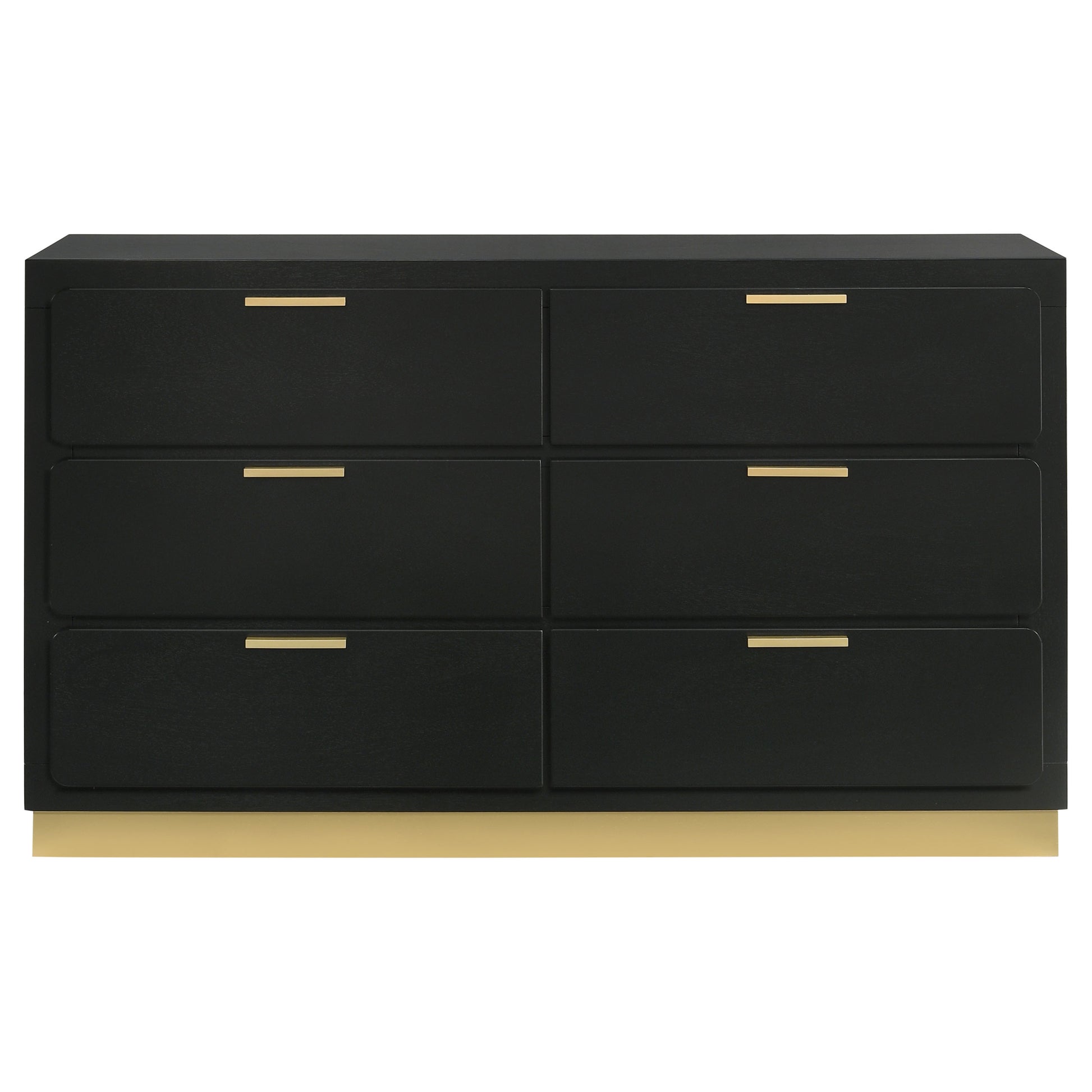 Modern luxury with a minimalist look offers a perfect fit for updated bedrooms as the six-drawer enhances a sleek master suite or guest bedroom. Wood and wood products construct a dresser with clean lines and a stylish Mid-Century Modern vibe. This dresser offers simplicity with sleek elegance, as accents include straight drawer handles and a matching base. Spacious drawers operate smoothly on center drawer glides. Choose this dresser for its versatility and convenience, accompanying either matching or coordinating pieces to pull a statement-making look together.