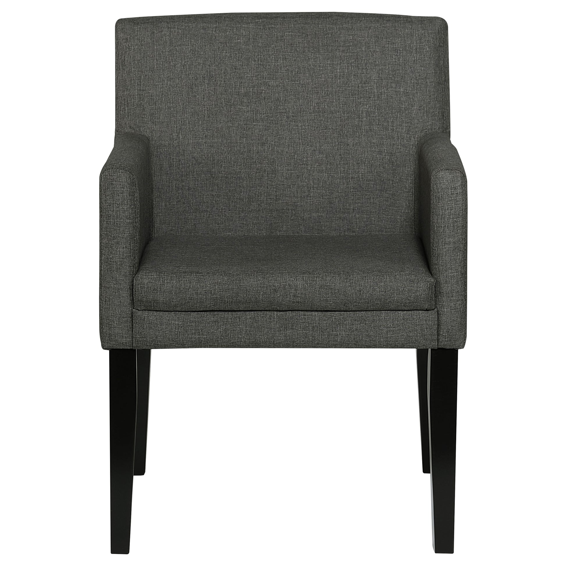 • Dining chairs have cushioned arms wrapped in durable charcoal grey fabric