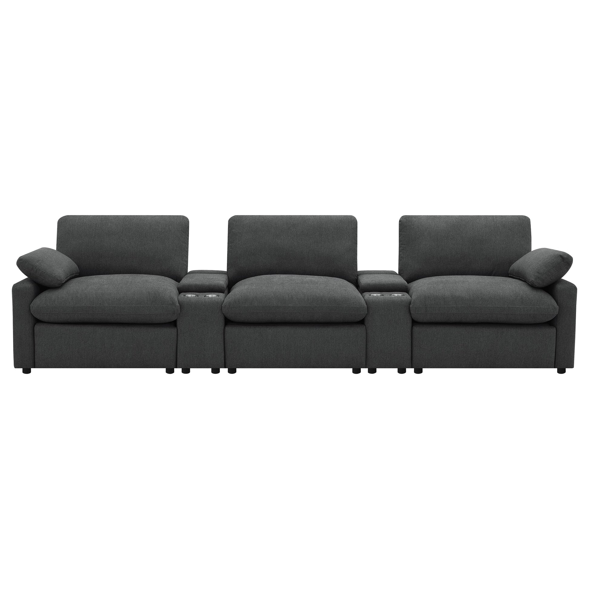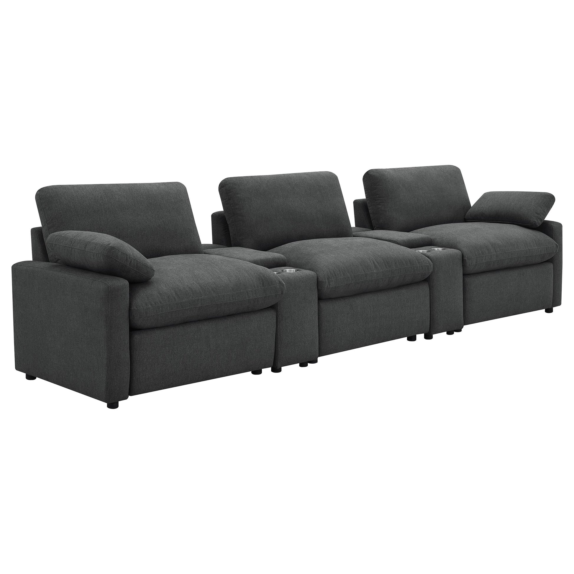This three-seat home theater seating set combines modern convenience with plush comfort. Each power recliner offers smooth adjustability, while two center consoles feature lift-top storage and dual stainless steel cup holders. Upholstered in soft fabric, the generously padded cushions and pillow-top armrests enhance relaxation. Built for durability and long-lasting support, this seating arrangement is perfect for creating a cozy entertainment space.