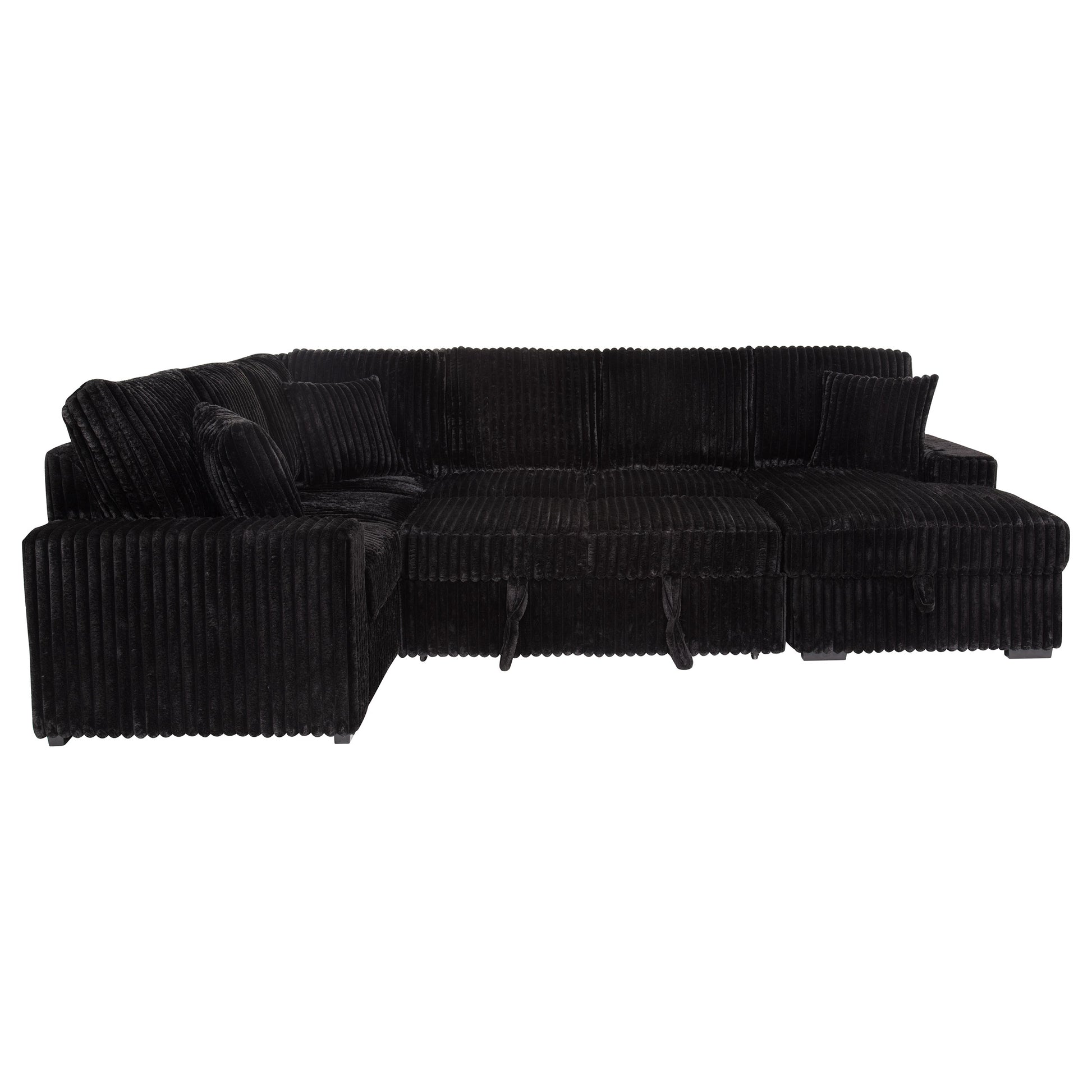This versatile corduroy sleeper sectional effortlessly converts from cozy seating to a comfortable guest bed with its pop-up sleep surface. A spacious storage chaise keeps essentials at hand, while plush upholstery and three matching pillows provide lasting comfort and style. Its neutral tone complements any décor, making this piece an ideal centerpiece for relaxation, entertainment, and accommodating overnight guests. Built for durability, it seamlessly blends form, function, and modern appeal.