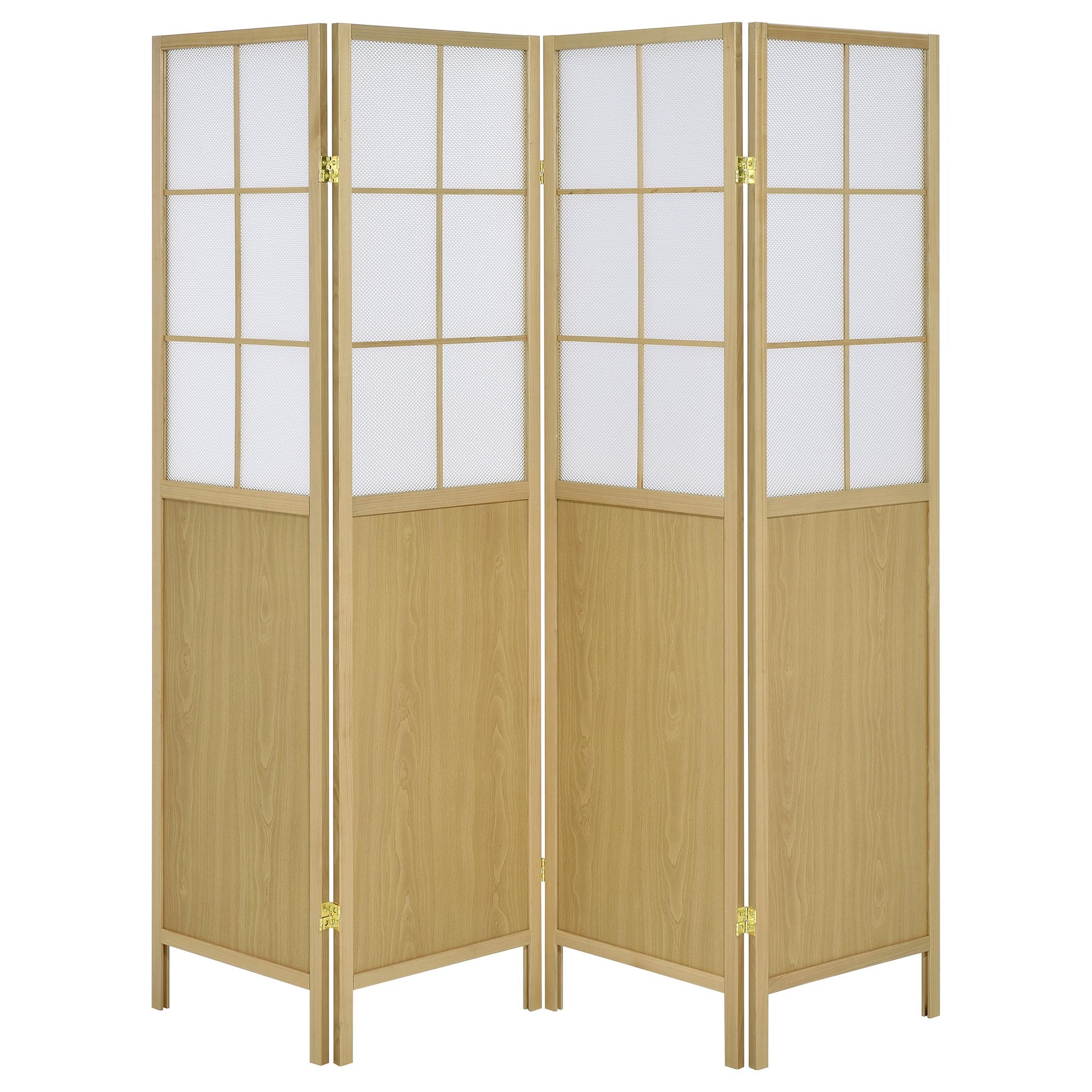 Blending form and function, this transitional four-panel room divider is the perfect solution in large bedrooms and open concept living spaces. It features four panels, each with a soft white, semi-opaque upper panels and a solid natural wood finish lower panels. The upper panels allow light to pass through and feature windowpane overlays for a touch of character. The frame of each panel features a natural wood finish and metal hinges allow easy movement. Use this room divider to section off a workspace in a large bedroom or to create structure in an open concept living room.