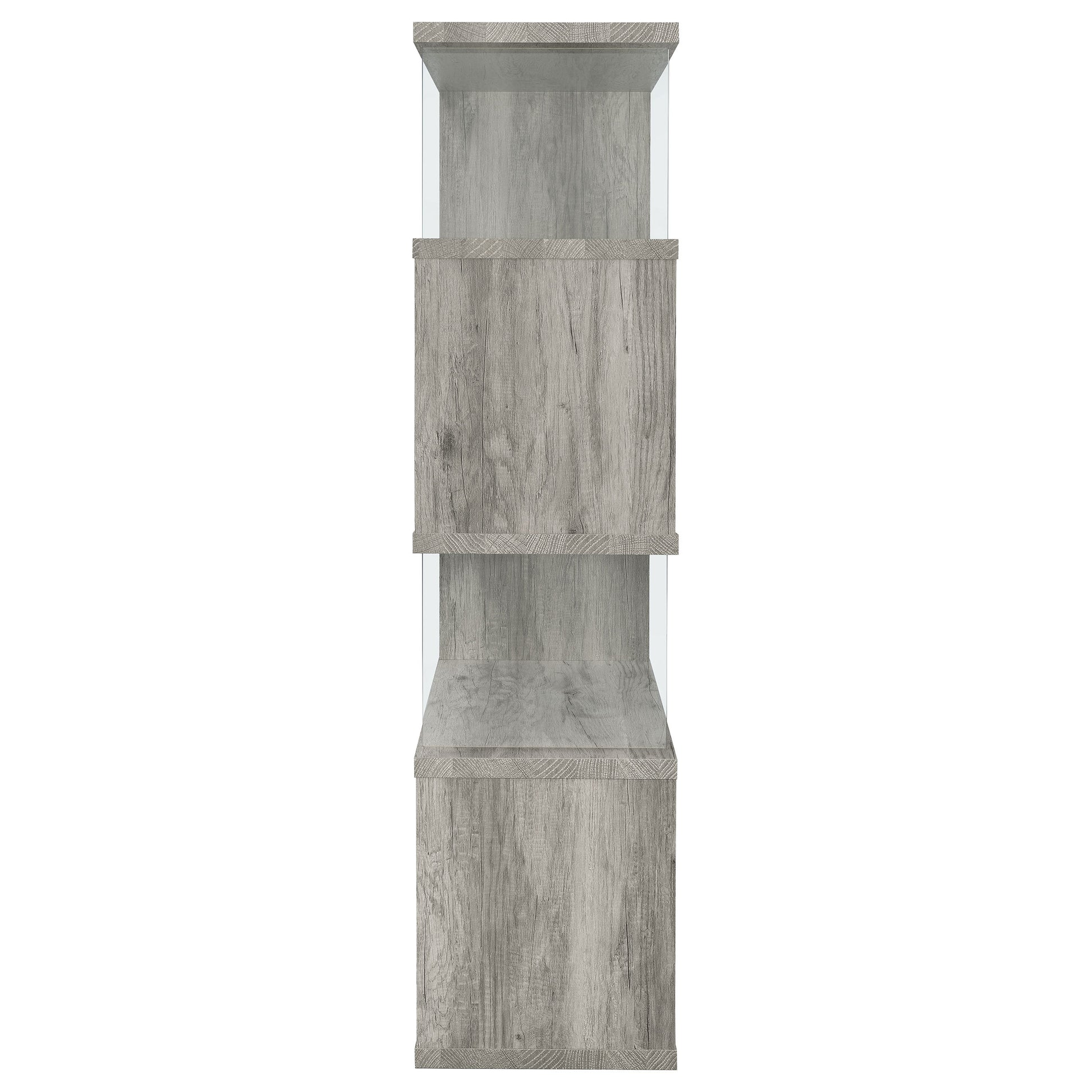 The asymmetrical zig-zag design of this contemporary bookcase creates a focal point in any room. Five open shelves in a light grey driftwood finish stack elegantly, supported by clear glass side panels that lend a modern flair to this furniture piece. Perfect for home offices, living rooms and much more, showcase anything from a book collection, decor, and other favorite items for all to see. With a flush base, this open bookcase unit rests sturdily and securely on the floor. Clean lines and a wonderful jagged design offer up style, functionality, and a stunning display.
