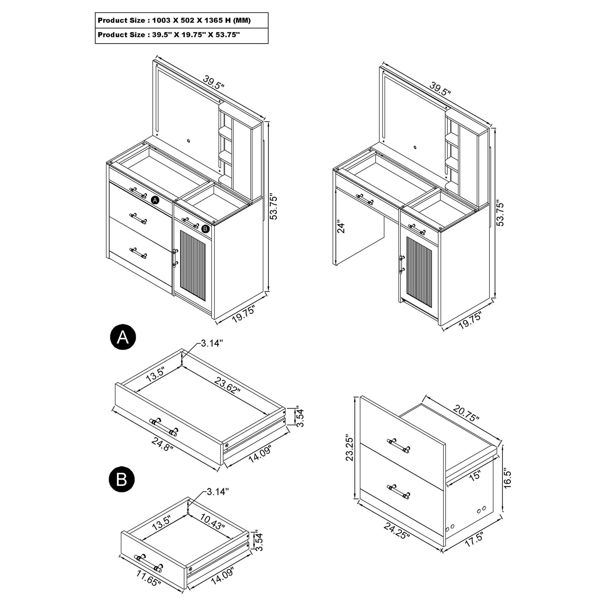 • Two drawers and a cabinet with a framed fluted panel for organized storage