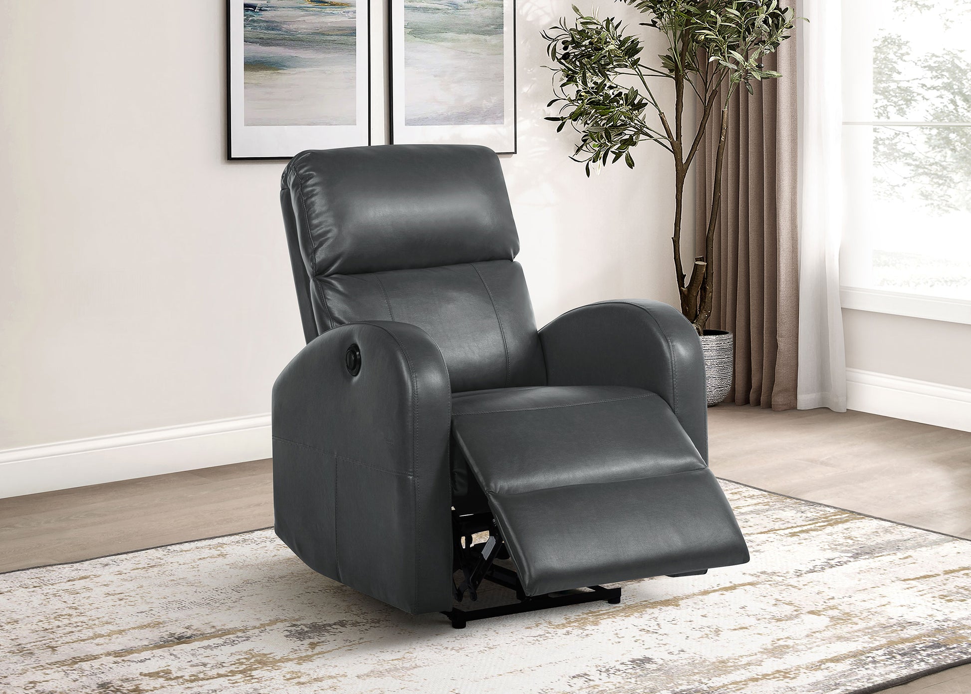 Create the perfect place for stylish lounging with a modern power recliner in your den or living room. It delivers a compact silhouette, offering on-trend style, with neutral faux leather upholstery. Its tall, slim back and plush seat feature foam cushioning, ensuring excellent comfort whether enjoying a movie or catching up with a friend. The power recline functionality is operated with buttons on the right-hand side, ensuring smooth performance. It's complete with track arms with an upward sloping profile perfect for contemporary and modern living spaces.