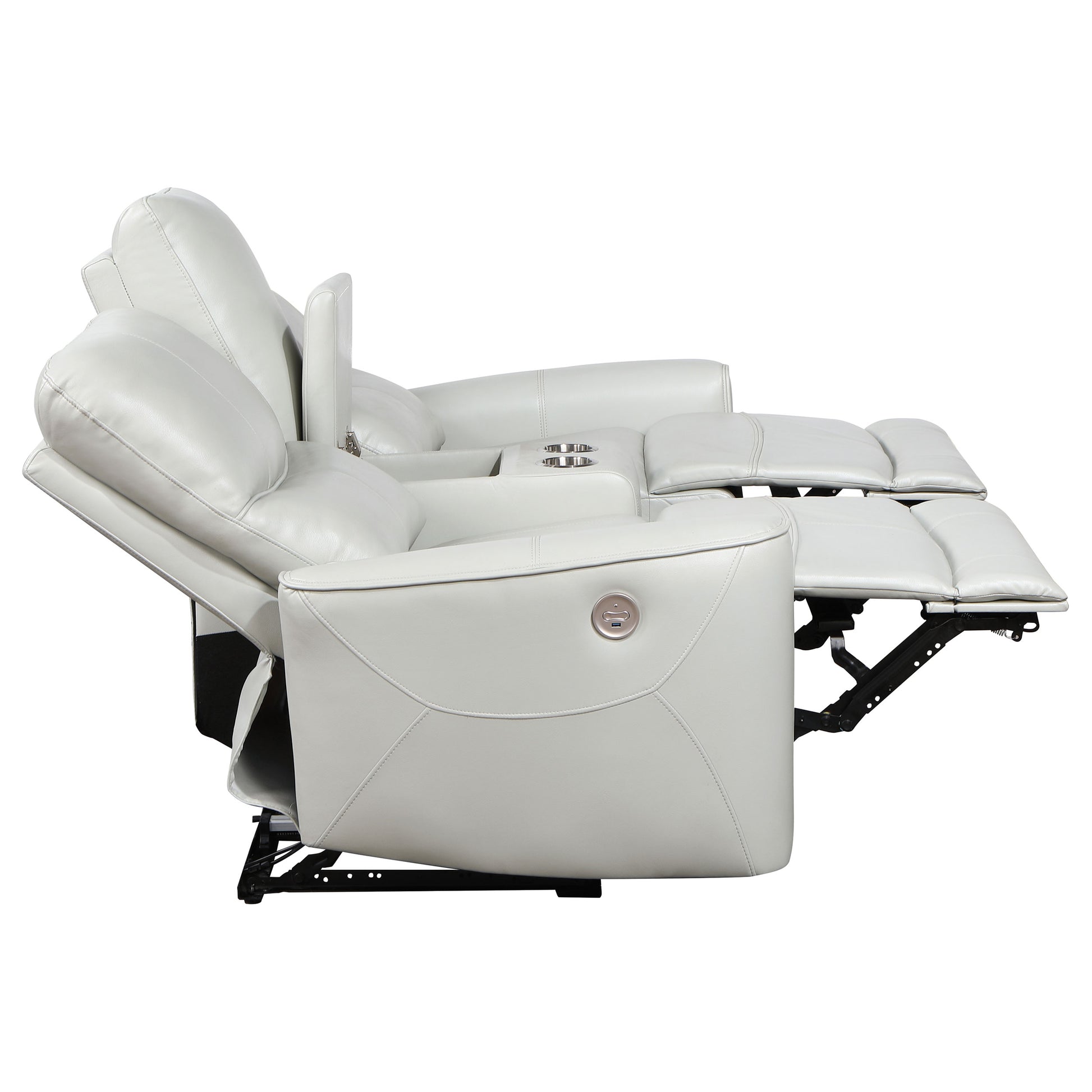 Contemporary elegance plays out in a clean, modern design as the power loveseat delivers beauty and comfort to a space reserved for easy entertaining and relaxing. Dove grey leatherette upholstery covers wood framing to provide a sturdy build, embellished with plump foam filled in tall, attached back cushions and supportive seat cushions. Subtle tufting cradles body positioning, aided in luxurious comfort by power reclining at the touch of a button on a switch panel with a convenient USB port. Store remotes and accessories in a flip-top console and keep beverages handy with dual cup holders. This power loveseat is all that's needed for a relaxing day or evening.