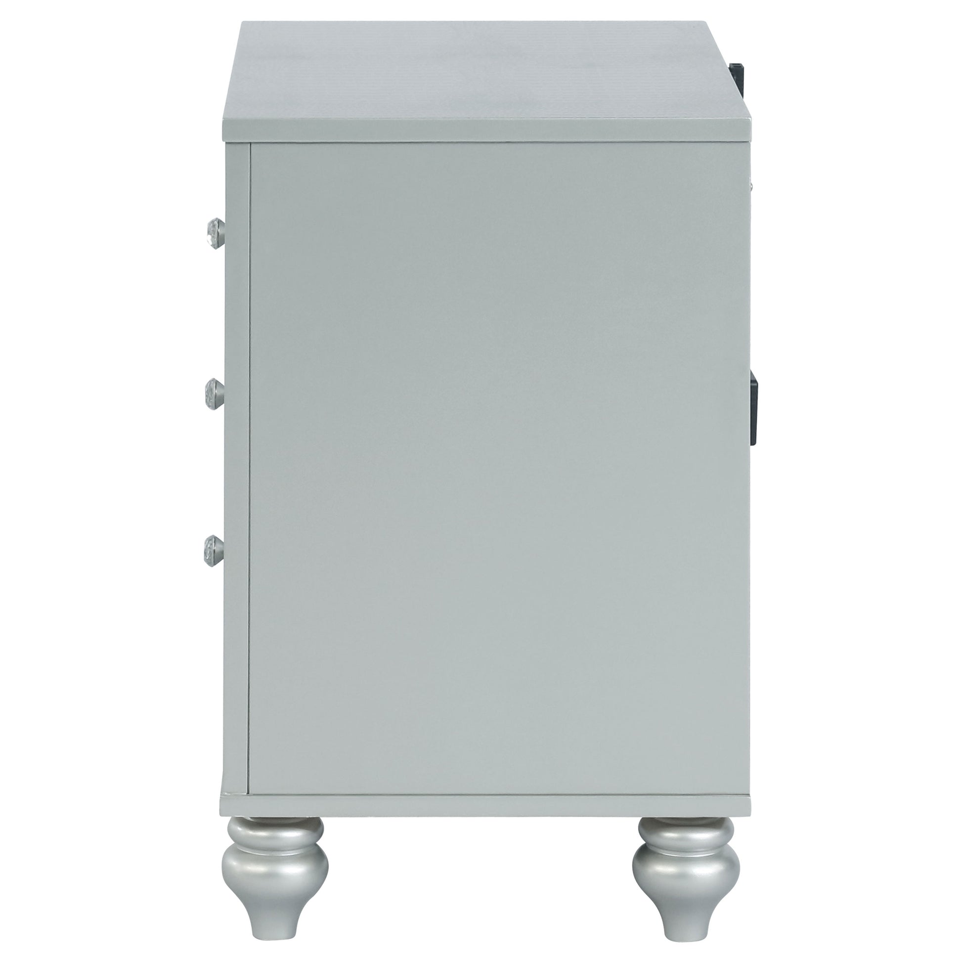 Bring modern glam to a classic design with this transitional two-drawer nightstand. It features a glitzy design that draws the eye in any modern home. It's crafted with a vibrant silver metallic finish with fret work detail on the front panels and drawer fronts. The drawers are adorned with crystal-like pulls and the top one is lined with black felt. Dual USB ports and delicate bun feet complete the design of this exquisite accent piece.