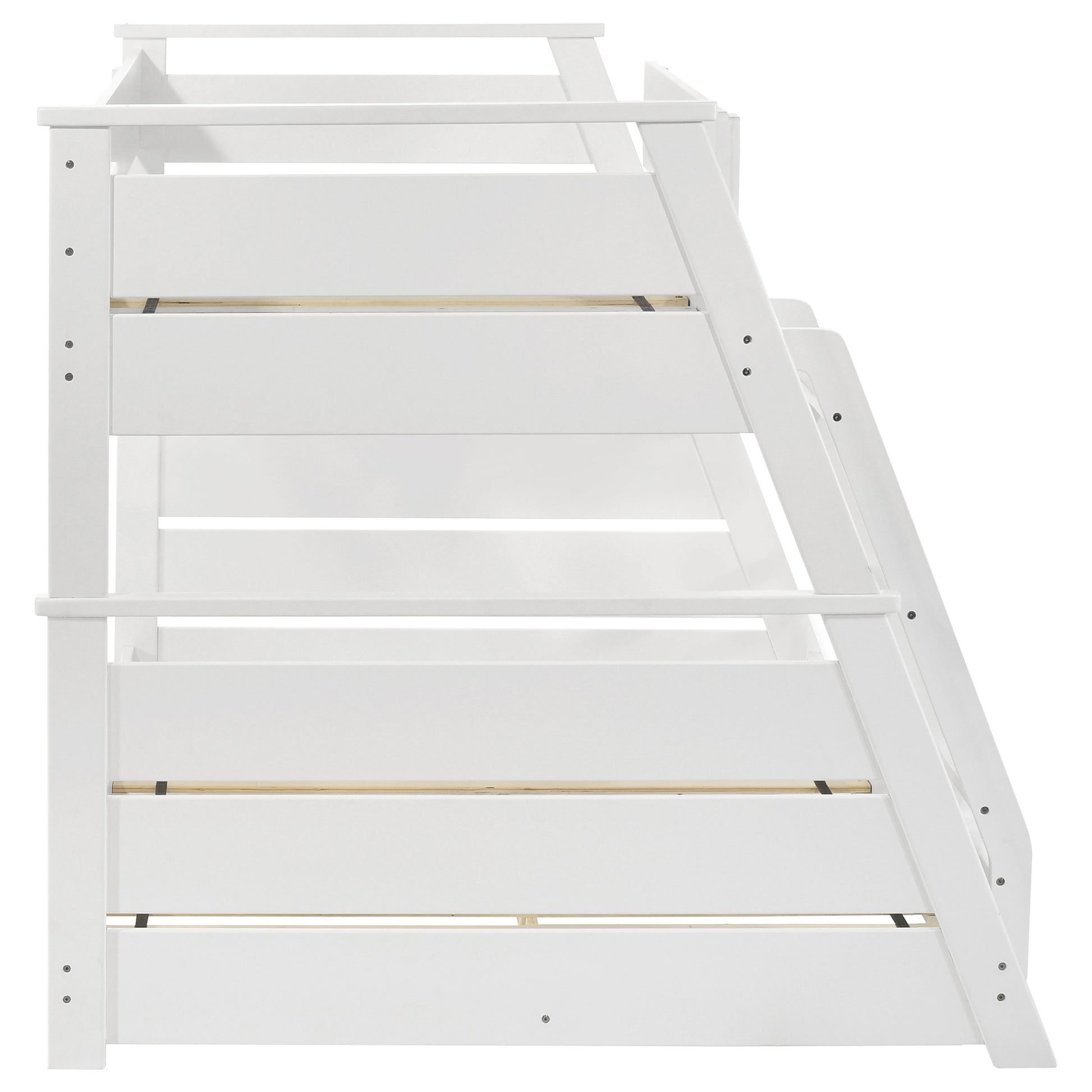 • Twin-over-full bunk bed with a crisp white finish for a clean, versatile look
