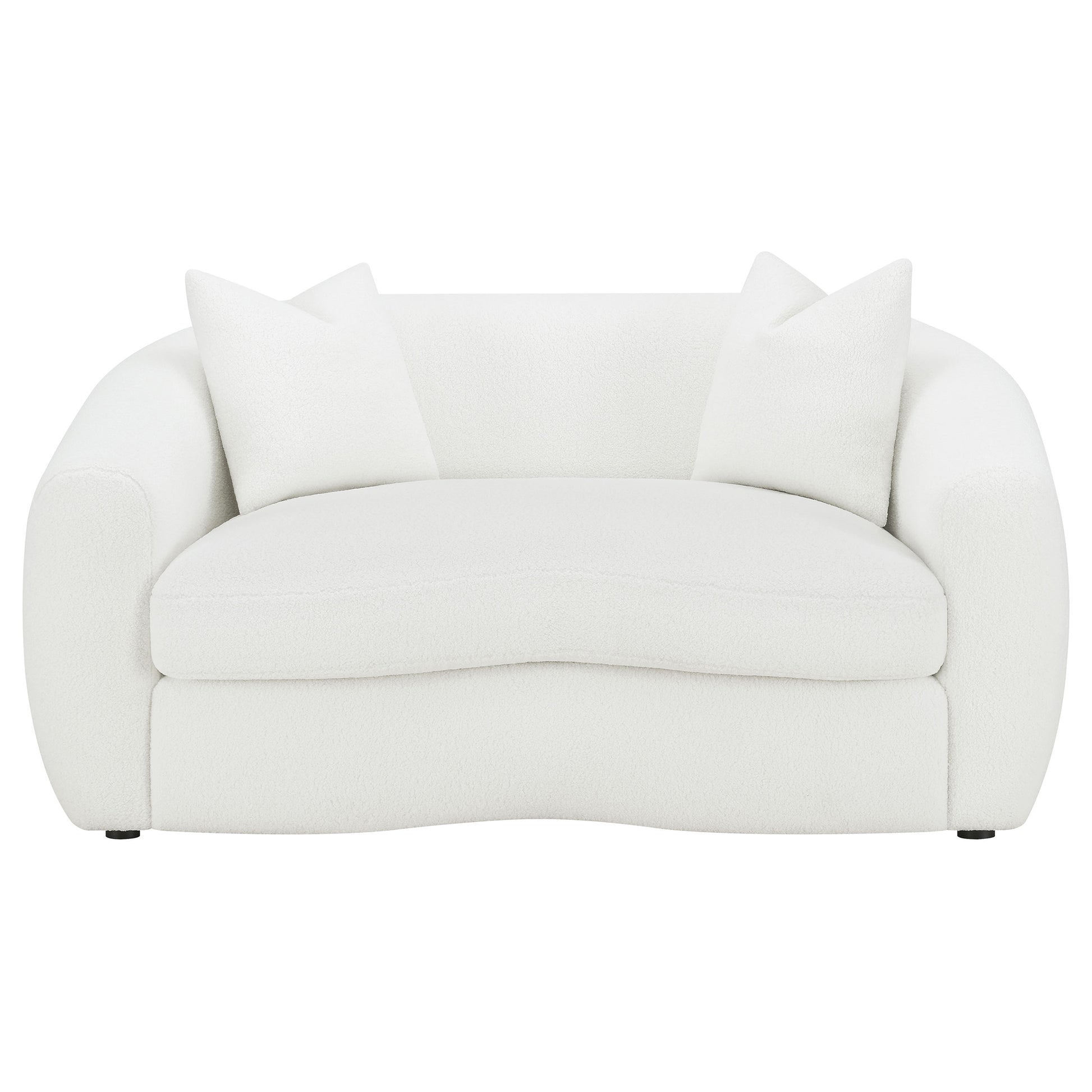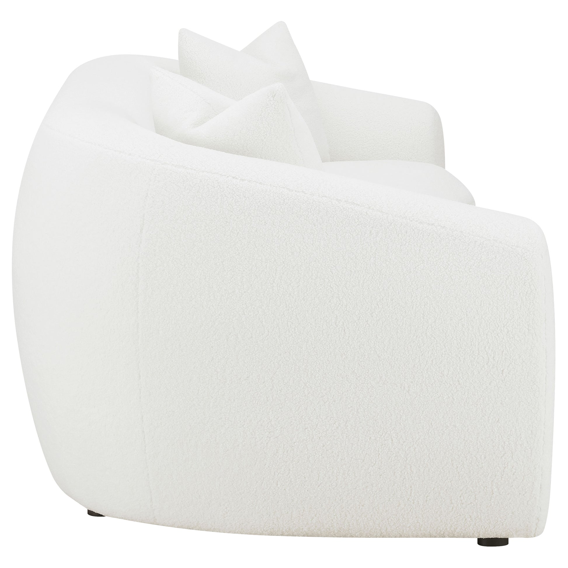 Softly sculpted and elegantly tailored, this modern sofa set exudes refined comfort through its plush faux sheepskin boucle upholstery. The gracefully curved silhouettes and sloped armrests bring an airy, cloud-like form that enhances any contemporary space. Plush cushions offer superior comfort and support, while faux down accent pillows provide inviting texture. Finished with black legs for a sleek contrast, this collection blends warmth, sophistication, and timeless design for the perfect modern retreat.