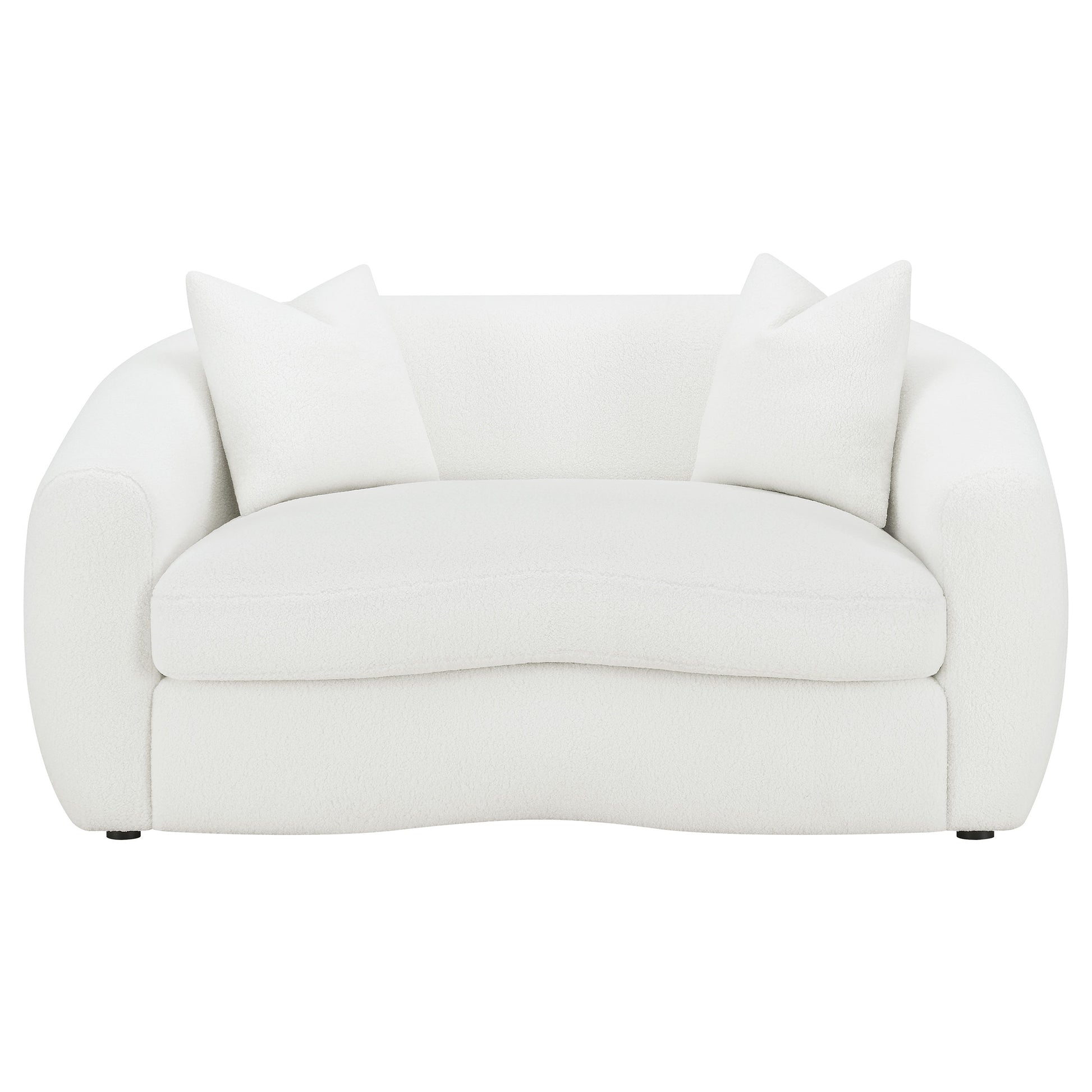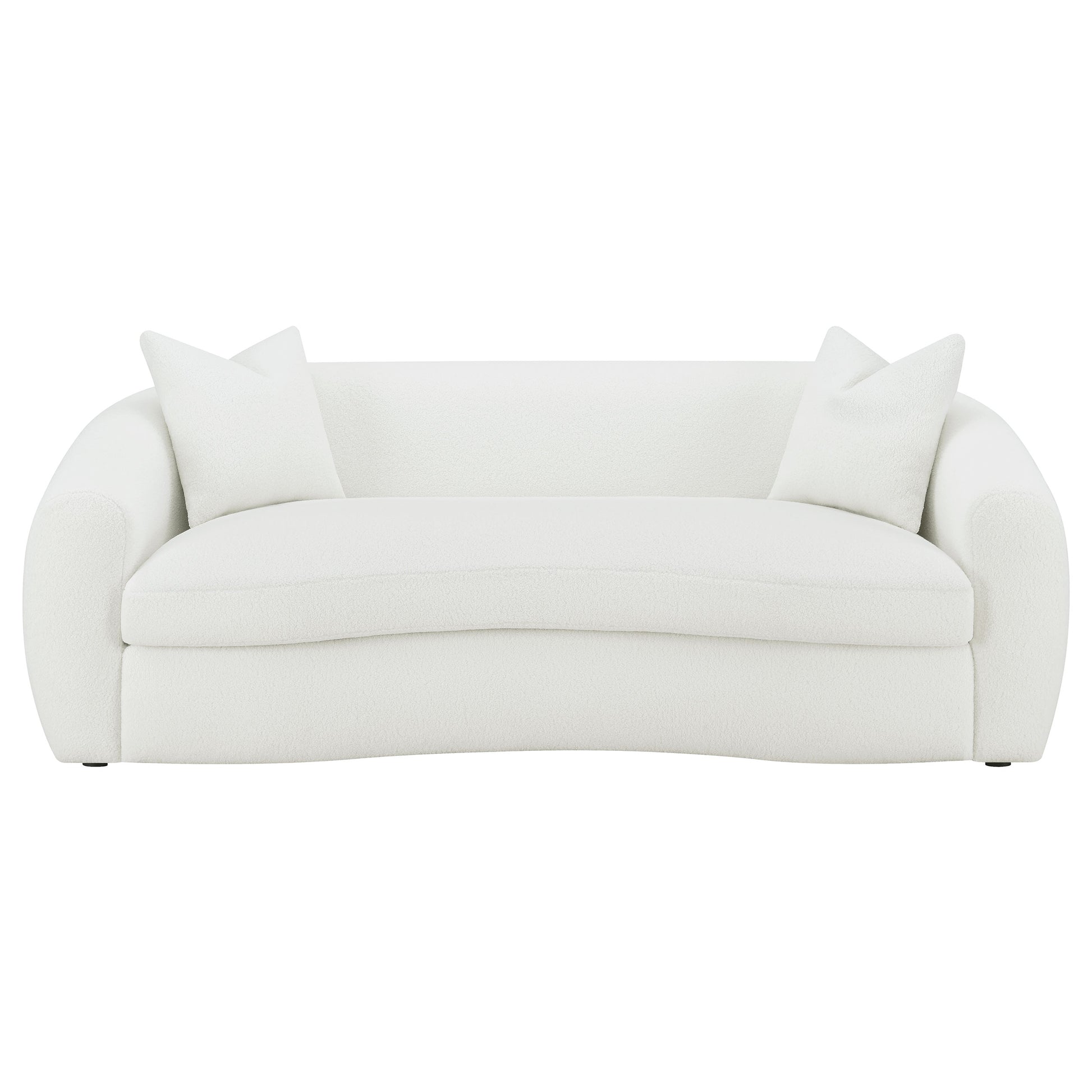 Softly sculpted and elegantly tailored, this modern sofa set exudes refined comfort through its plush faux sheepskin boucle upholstery. The gracefully curved silhouettes and sloped armrests bring an airy, cloud-like form that enhances any contemporary space. Plush cushions offer superior comfort and support, while faux down accent pillows provide inviting texture. Finished with black legs for a sleek contrast, this collection blends warmth, sophistication, and timeless design for the perfect modern retreat.