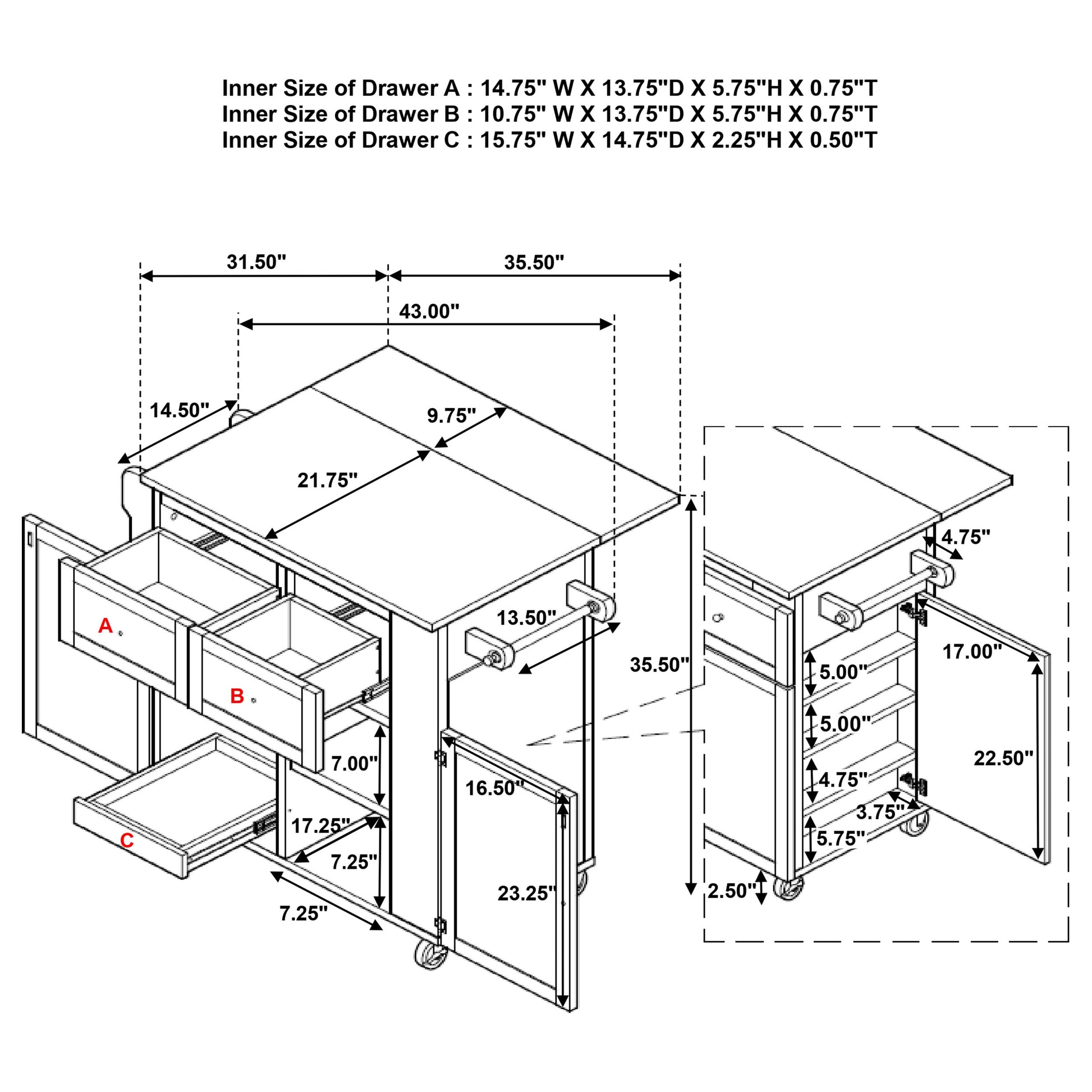Make your kitchen as functional and fashionable as possible. With a bright modern farmhouse motif, this kitchen cart organizes tasks and storage options into one central unit. Solid rubberwood offers a stylish composition that shows off a butcher block work surface. Fresh white and natural brown finish deliver decor versatility. Keep tasks simple with a towel rack, spice rack, a hidden cabinet for trash, and casters for portability.