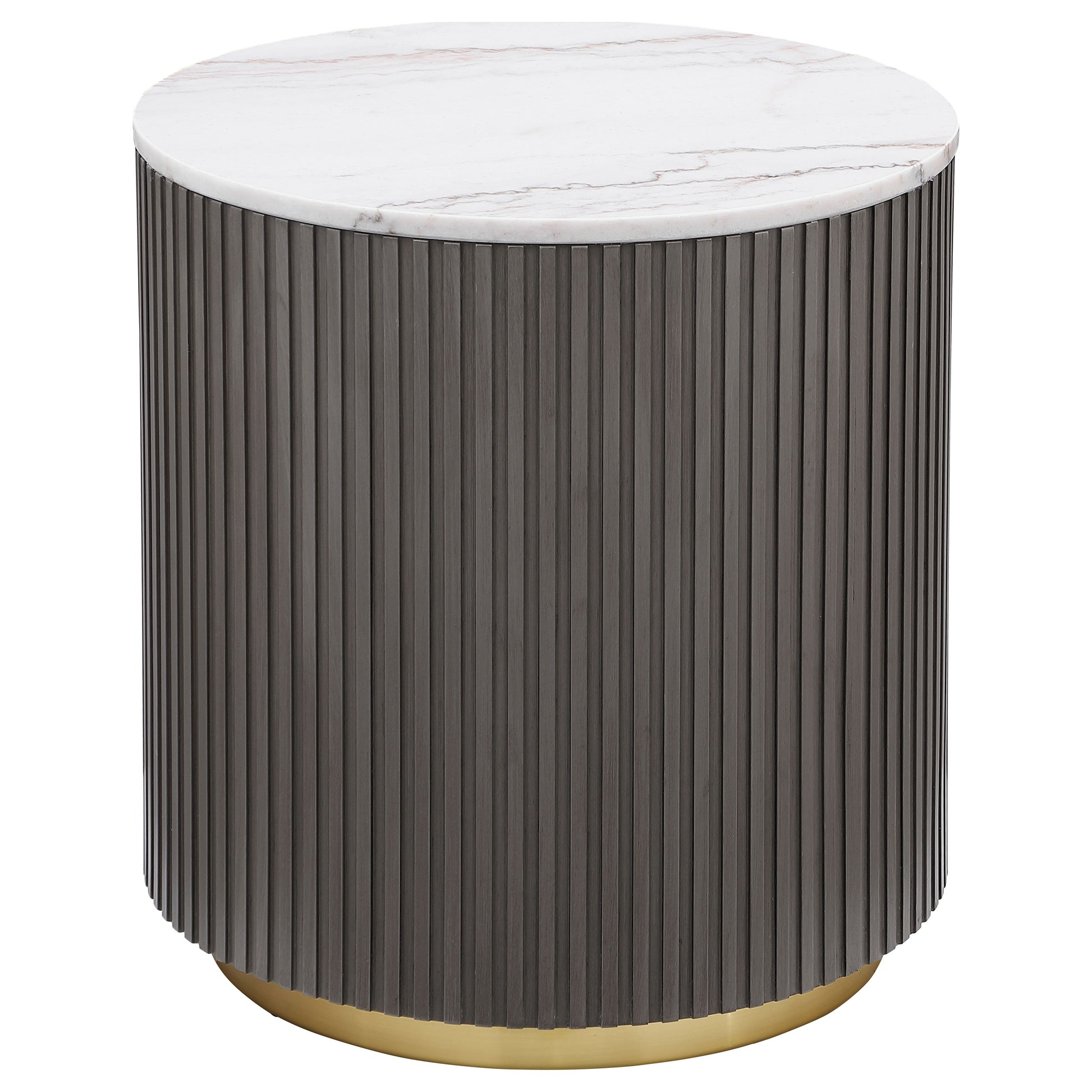This elegant coffee table set features a modern round coffee table and end table with a genuine white marble tops. The engineered wood frame in a charcoal finish is accented by ribbed detailing, offering a textured and contemporary look. Each table sits on a brushed gold metal base that adds a touch of luxury. The set's refined materials and sleek design make it a perfect addition to any living room, creating a balanced atmosphere of sophistication and style.