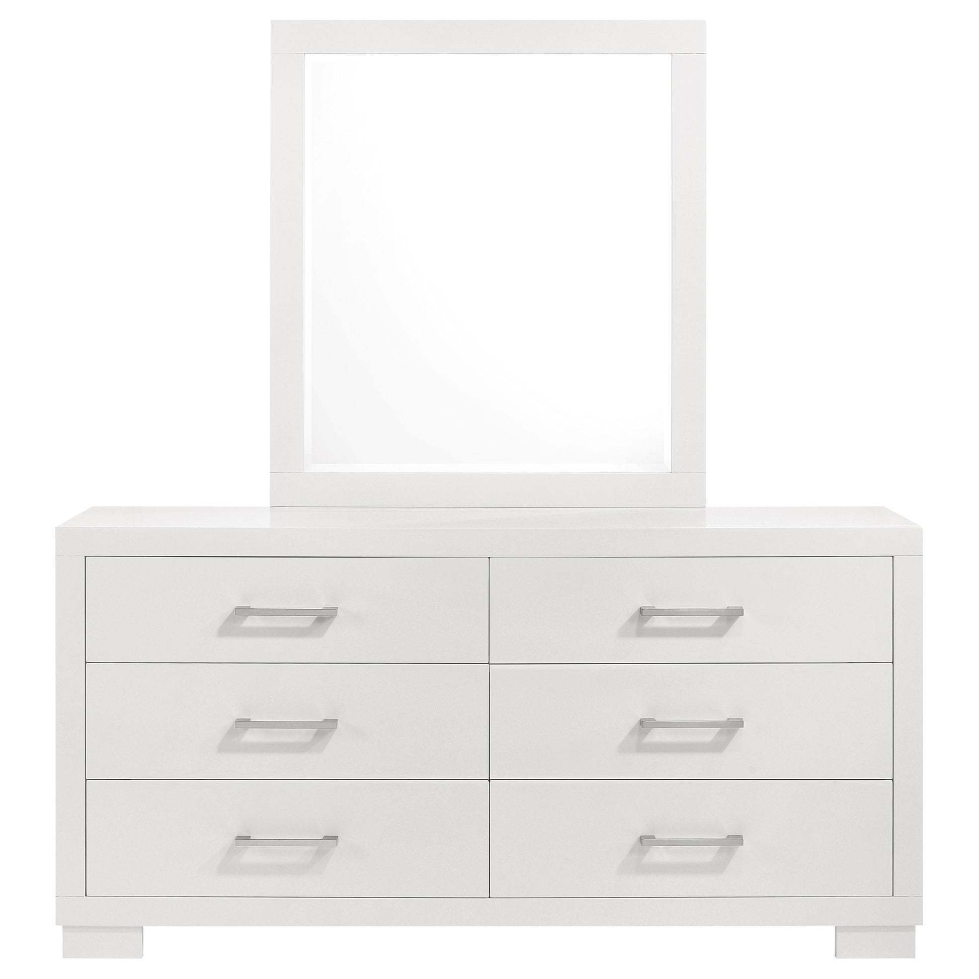 Elegant simplicity defines this dresser and mirror set, offering balance between refined design and everyday function. The six-drawer dresser provides generous storage, while the coordinating beveled mirror brings light and dimension to the room. Sleek bar pulls complement the sturdy wooden construction, creating a harmonious blend of practicality and sophistication. Perfect for modern bedrooms, this pairing completes the space with enduring grace and quiet elegance.