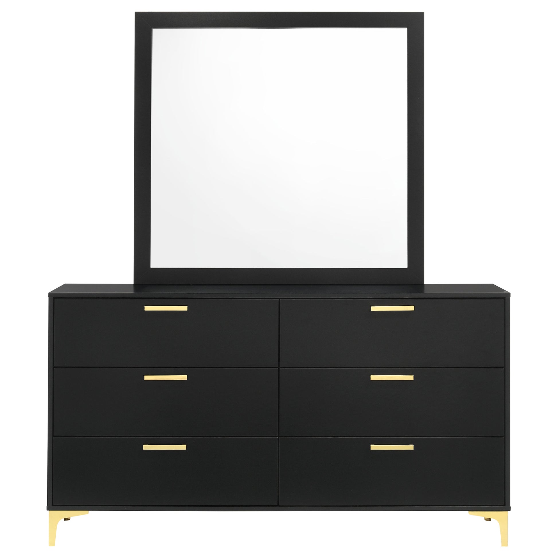 Elegance meets functionality in the 224453M Dresser and Mirror set, with its modern glam design that maximizes your space while offering ample storage. The sleek dresser's boxy black frame and six spacious drawers provide a bold and organized focal point in your bedroom. Each drawer, accented with slender gold pull handles, contrasts beautifully with the black finish, while the gold bracket legs echo the metallic theme. The accompanying mirror's tall, clean-lined frame enhances the setup, creating an ideal vanity space that blends seamlessly with any color palette. This set is not just a statement piece; it's a testament to sophisticated design that serves everyday needs with style.