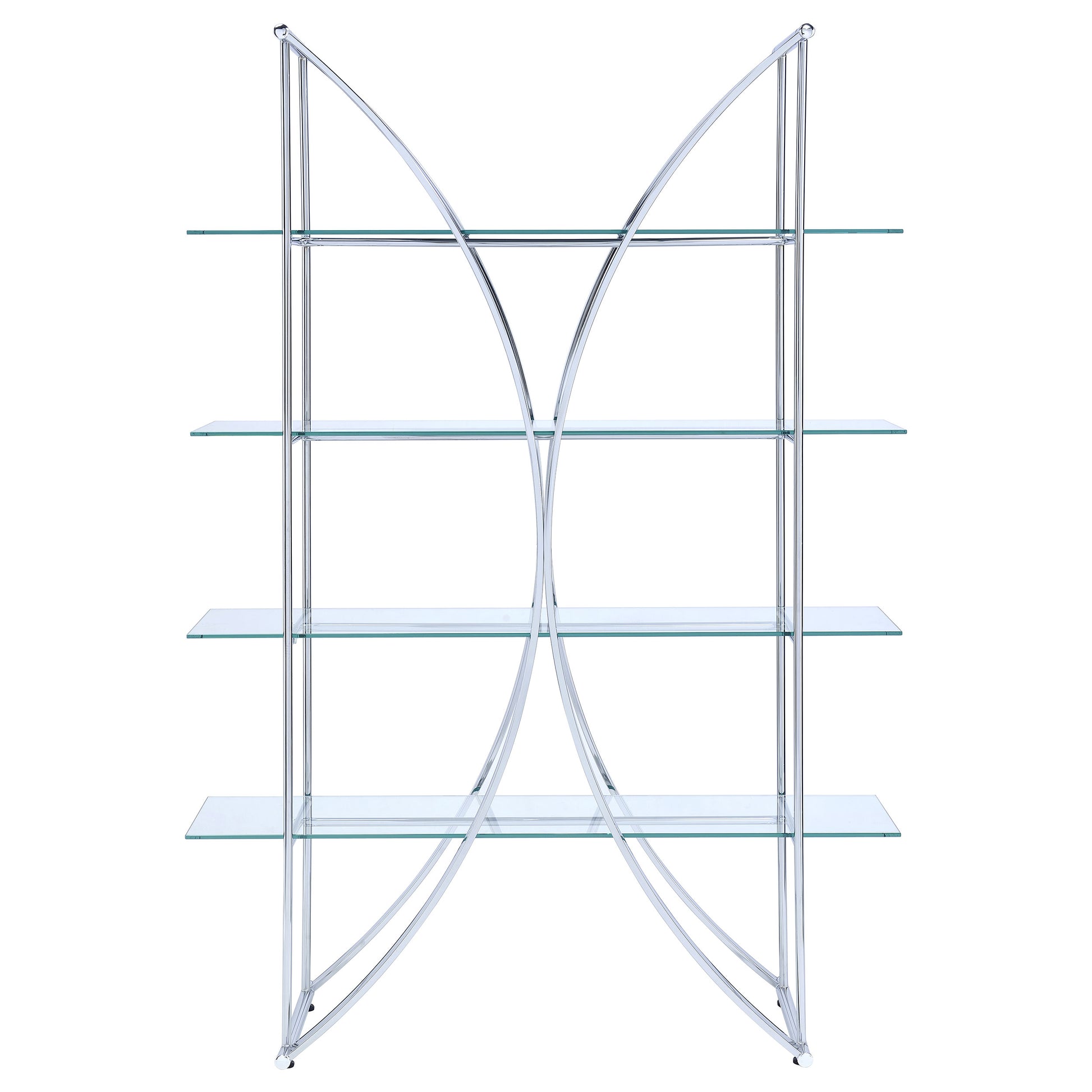 The ultimate in contemporary design rests in this eye-catching bookcase. Modern architecture meets art in a compelling silhouette blending arc-shaped and linear steel frames with clear tempered glass shelves. Four tiers offer ample space for displaying books, decor, and potted greenery. A fresh chrome finish adds luster to a tastefully designed contemporary space. Energize a modern room with a subtle yet tasteful bookcase.