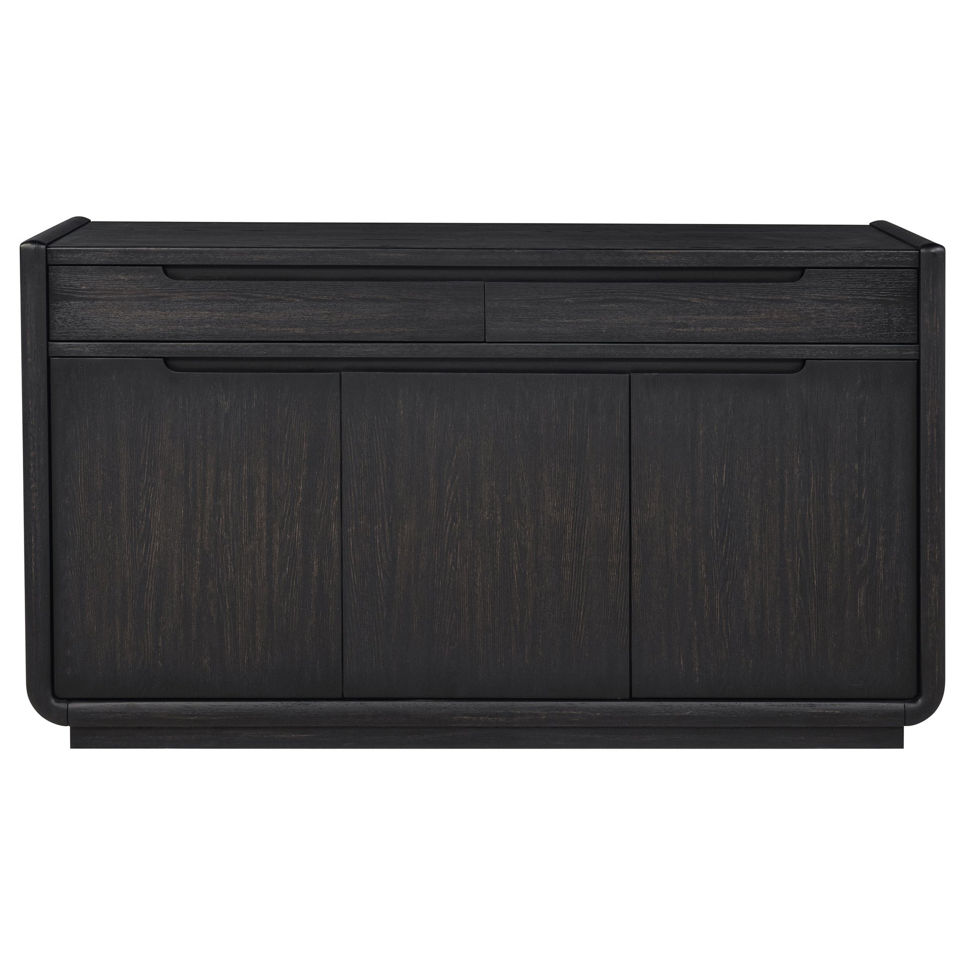 With a presence both grounded and graceful, this sideboard offers quiet beauty and purposeful design. Draped in a burnished black finish, its soft curves and minimalist lines open to thoughtful storage, two felt-lined drawers for treasured linens and flatware, and three softly closing doors revealing fixed shelves behind. Each detail, from the whisper-quiet glides to the dust panel below, is a study in balance, offering elegance that lingers long after the meal is done.