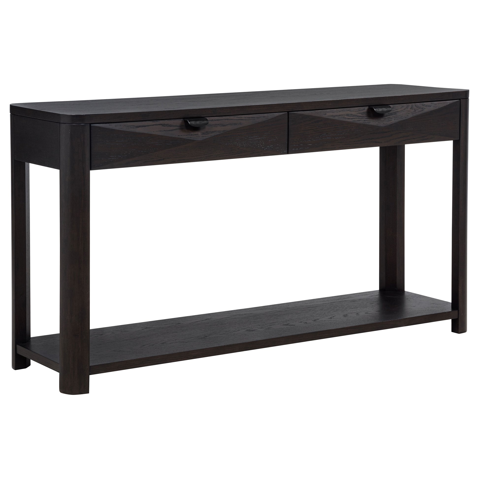 • Sofa console table in coffee features two drawers, open shelf storage, and wide top