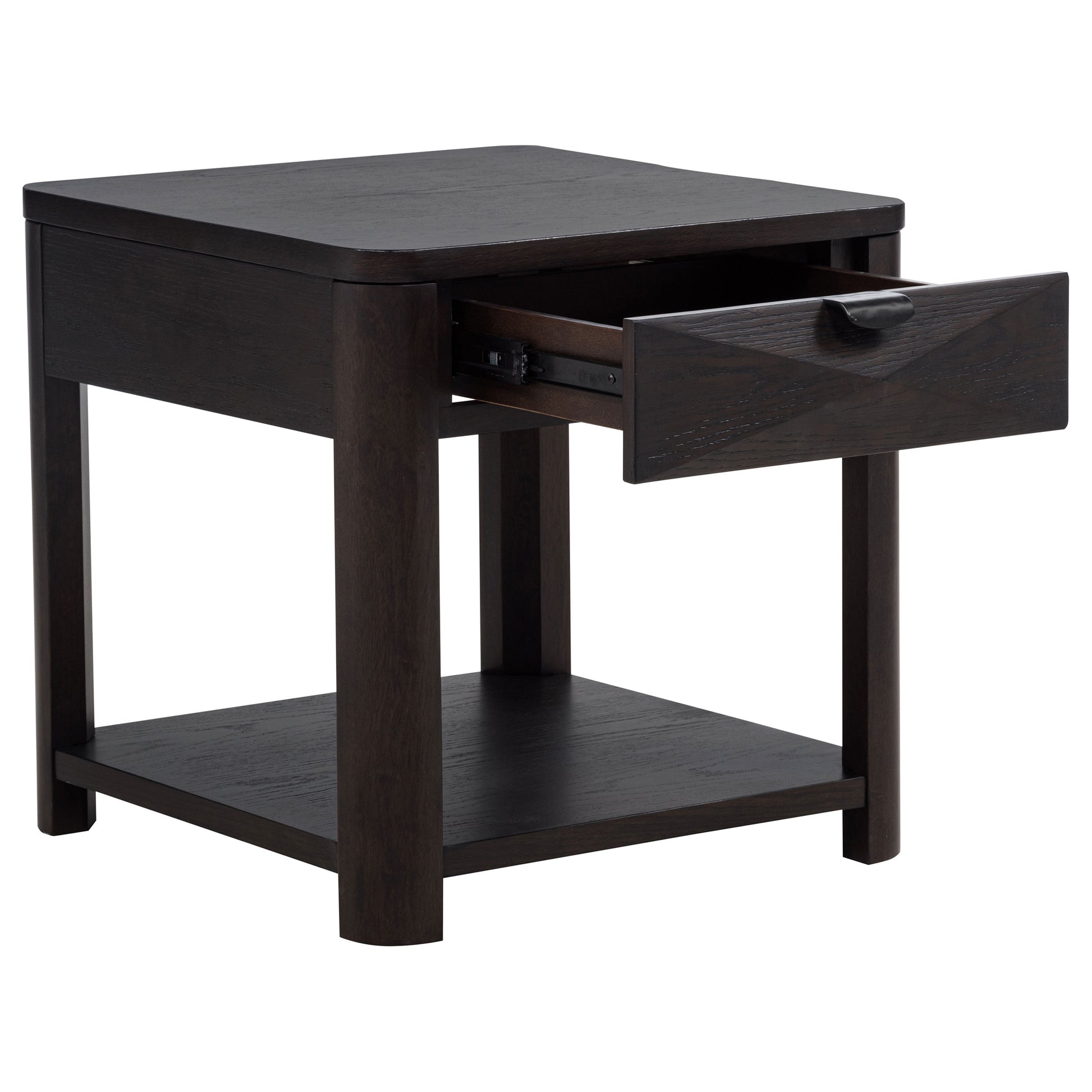 • End table in coffee features one drawer, open shelf storage, and a clean frame
