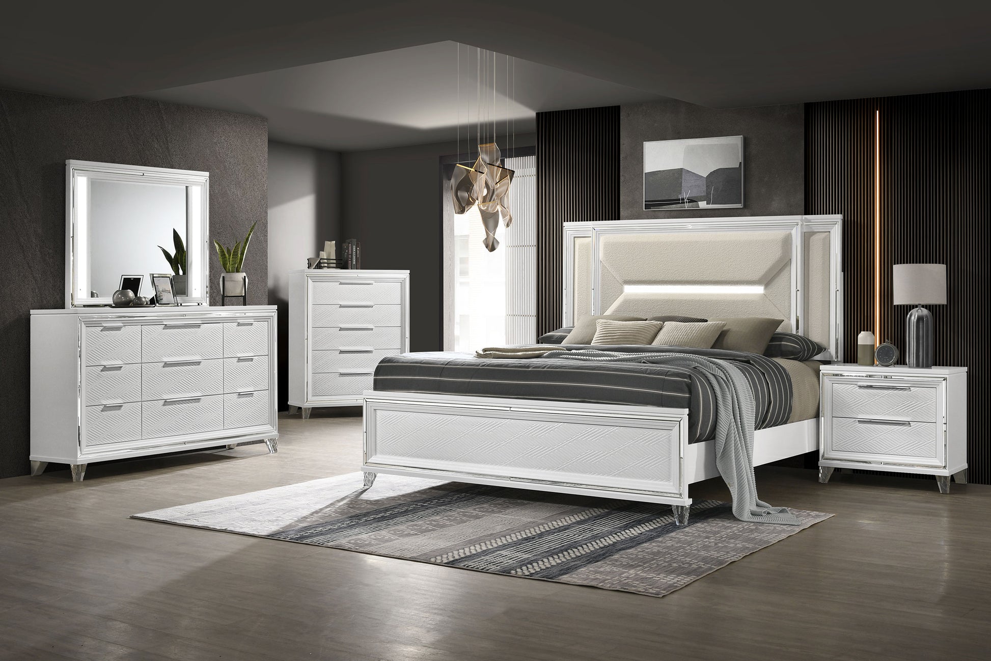 Maximize your bedroom storage with this stylish 5-drawer chest, featuring a modern Italian design. The white finish and picture framed recessed panels with embossed herringbone graphic patterns create a sophisticated look. Accented with mirror framing, acrylic legs, and polished chrome metal hardware, this chest offers ample storage space. Crafted from rubberwood, MDF, and mirror, this chest combines style and practicality, making it a perfect addition to your luxurious bedroom.