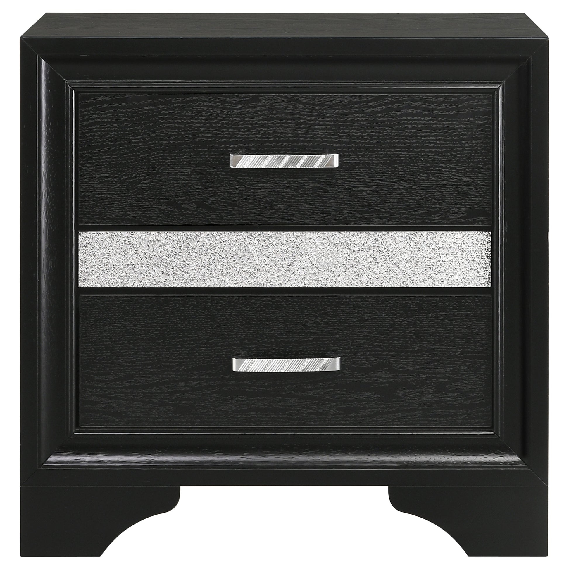 Glittering trim and a black finish create a sense of sophistication for a four-piece modern bedroom set. Designed to make a statement, the set focuses on a bed that boasts a crisp, clean-lined silhouette that pairs a rectangular headboard with padded black upholstery. Glittering diamond-like trim adorns the head and footboards of the bed and makes a statement on both the nightstand and dresser. Drawers are accentuated with jewelry inspired bar pulls that add to a gleaming presentation. Bracket feet complete the look of each piece in this set, offering a touch of timeless character and subtle movement.