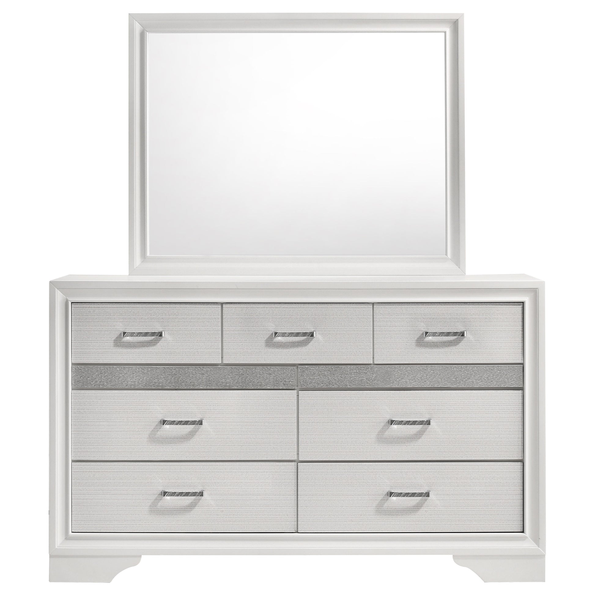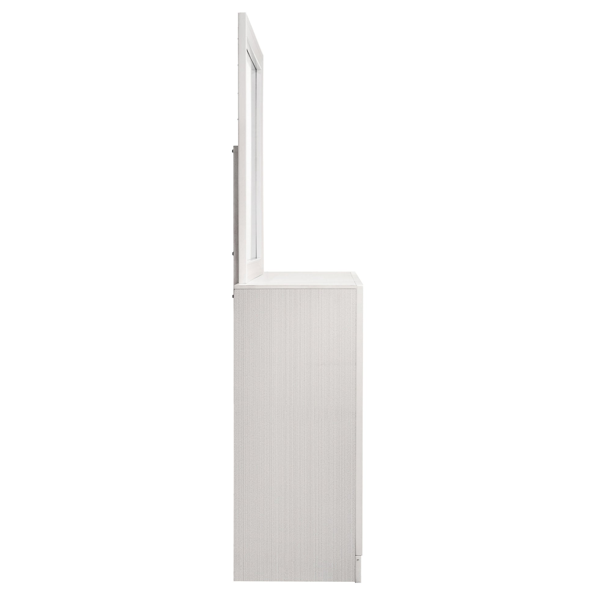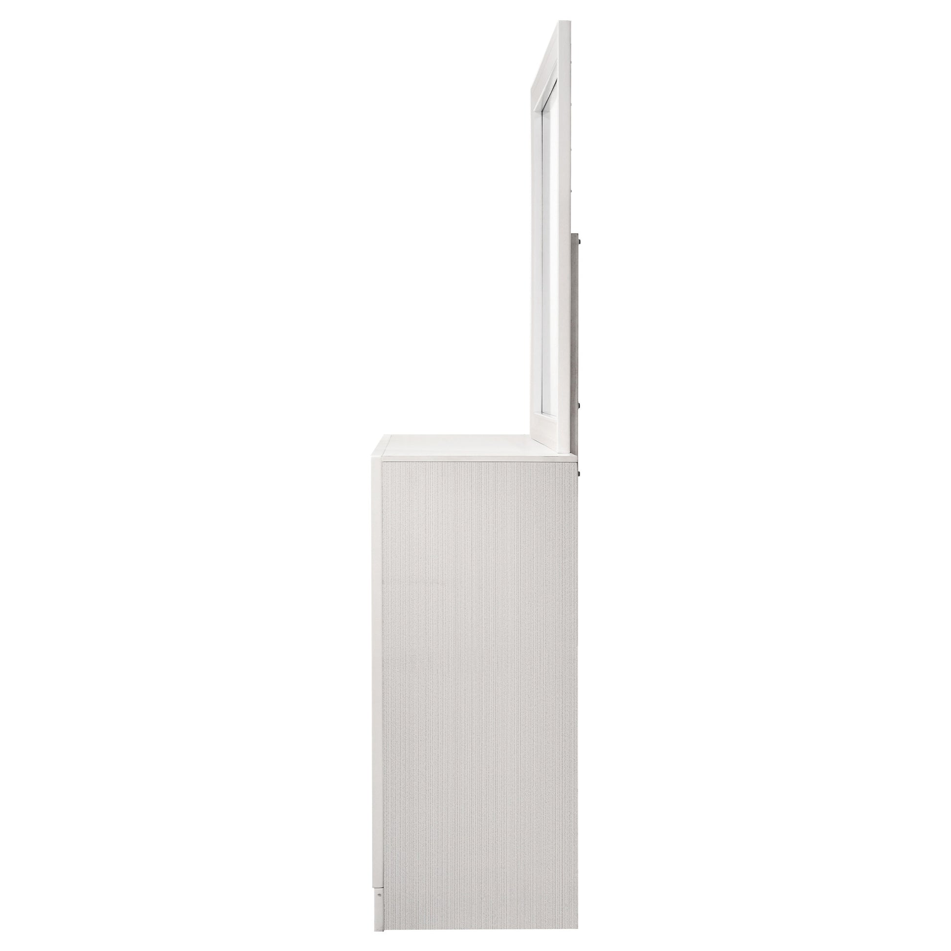 Bring sophisticated grace to your bedroom with this chic dresser, designed to lend an elegant touch to your personal sanctuary. Its felt-lined drawers offer safekeeping for delicate belongings, while the hidden jewelry drawer provides a discreet space for your treasures. The glittery panel across the front sparkles with opulence, enhancing the dresser's allure. Complementing the piece is the cheerful mirror, whose linear design and framed construction add a stylish ambiance. Choose from various finishes to perfectly round out your bedroom's design scheme.