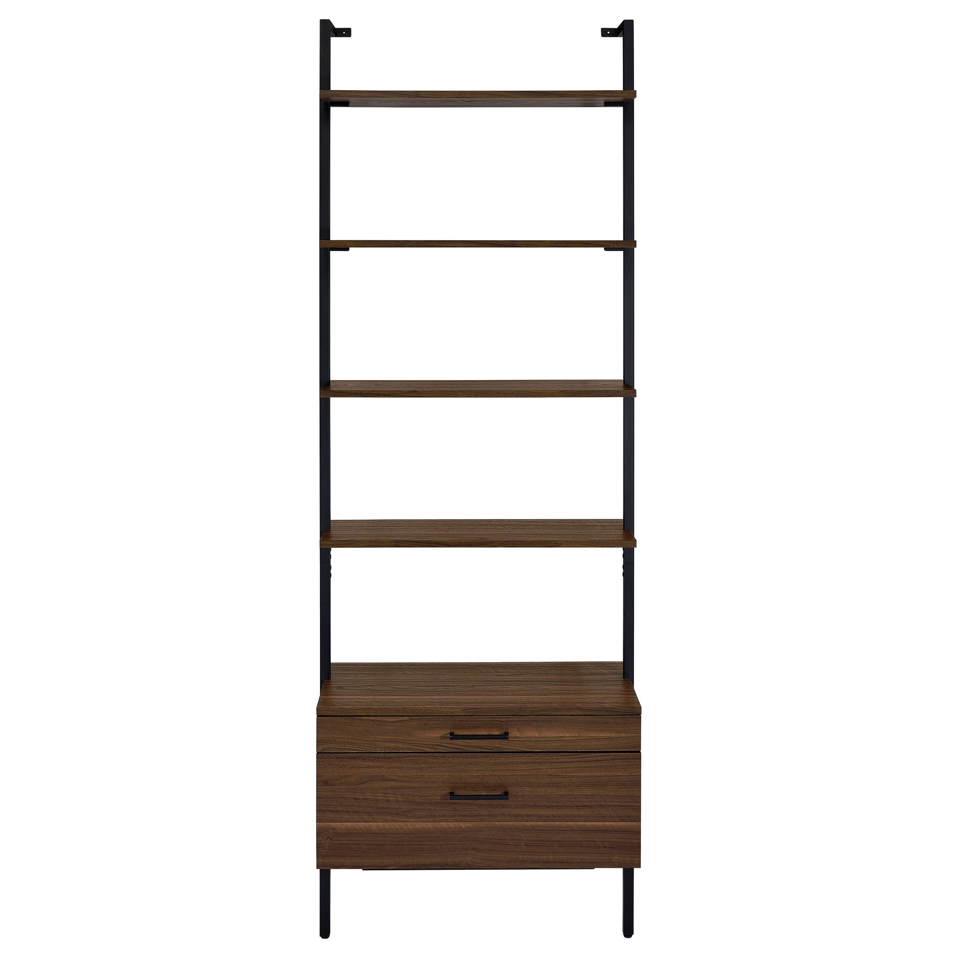 Elevate your home with this modern three-piece bookshelf set, combining sleek design with practical storage solutions. This set features two open shelf bookcases and one bookcase with drawers, each offering a refined and airy ambiance that complements any contemporary space. The open shelves are perfect for showcasing books, decor, and personal treasures, all set within a black metal frame that adds stability and minimalist appeal. The central bookcase includes two drawers, providing hidden storage to keep your space organized and clutter-free. Finished in a warm walnut tone, this versatile bookshelf set is ideal for creating a cohesive, stylish display in your living room, home office, or dining area.