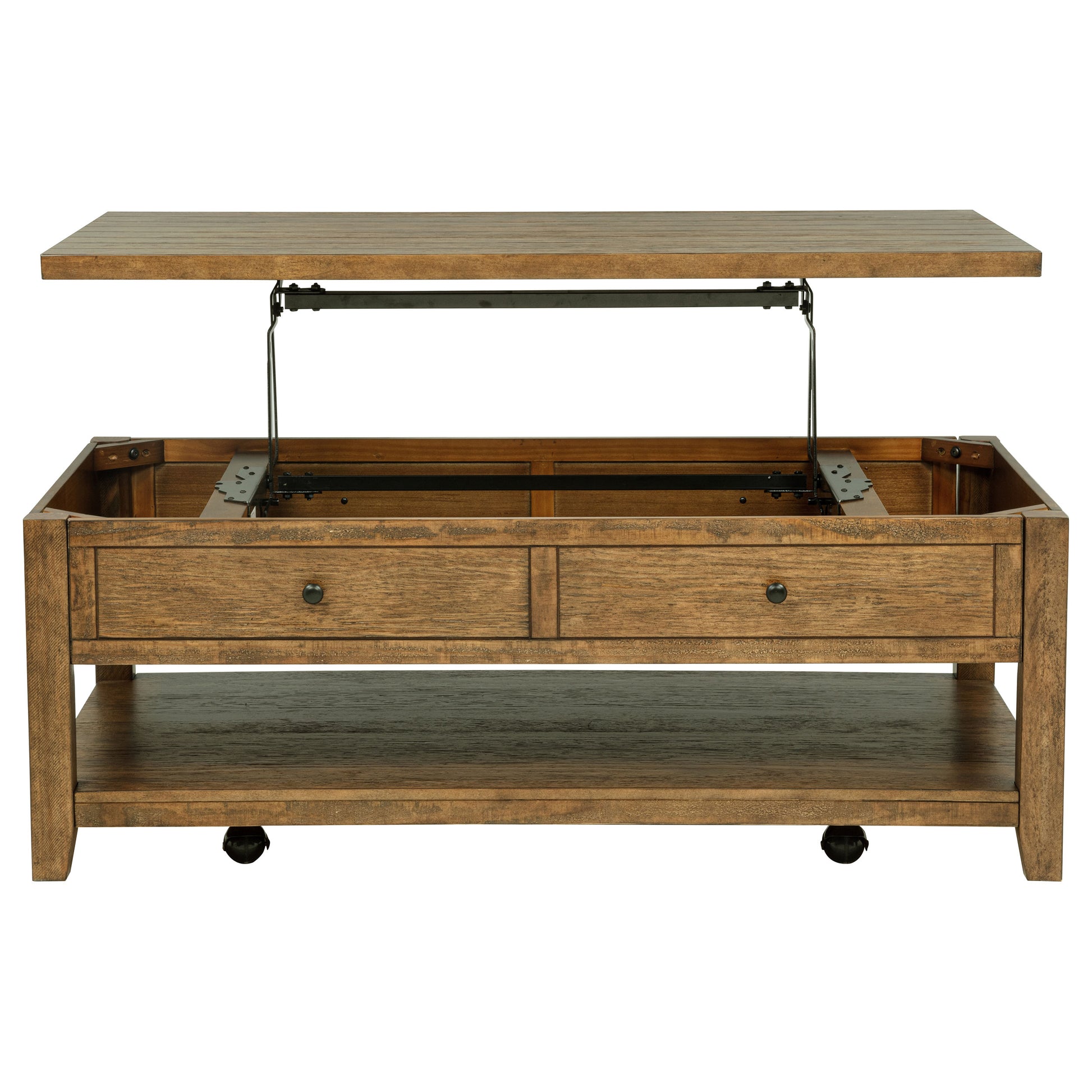 Blending versatility and warmth, this lift-top coffee table brings function and charm to everyday living. Its clean, structured silhouette is elevated by a spacious tabletop that rises for dining or work, while interior storage keeps essentials neatly tucked away. A wide lower shelf adds room for display or baskets, and built-in casters ensure effortless mobility. Crafted from pine, veneer, and engineered wood, it offers grounded style with everyday flexibility.