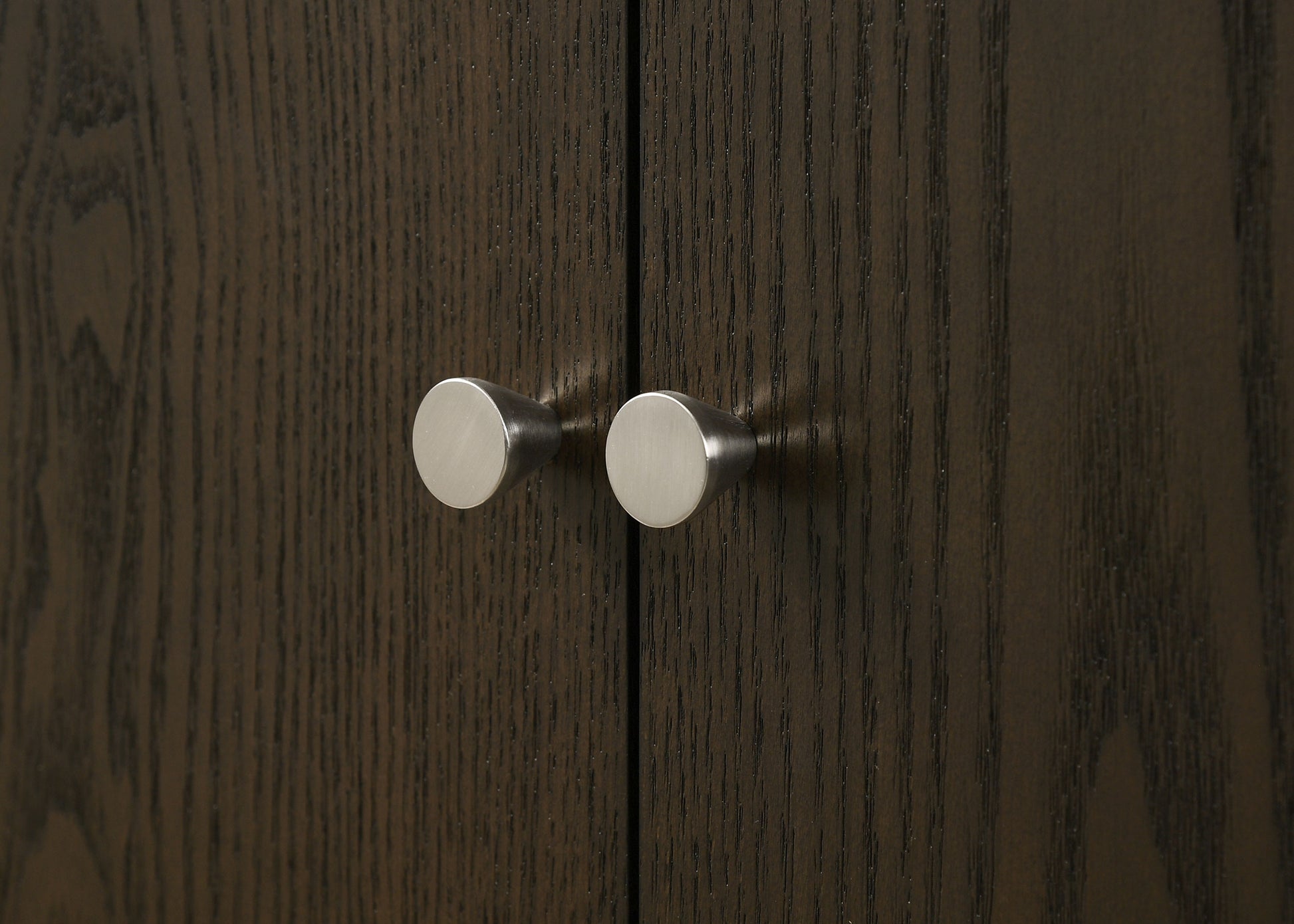 Add both style and functionality to your dining room with this elegant sideboard, finished in a sophisticated ash brown wood tone. The clean-lined design features four cabinet doors that open to reveal spacious shelving, perfect for storing tableware, linens, or other essentials. Crafted from engineered wood, rubberwood, and ash veneer, it ensures long-lasting durability. Sleek metal-capped tapered legs and minimalist hardware accents complete the modern aesthetic, making this sideboard a refined and practical choice for your dining area.