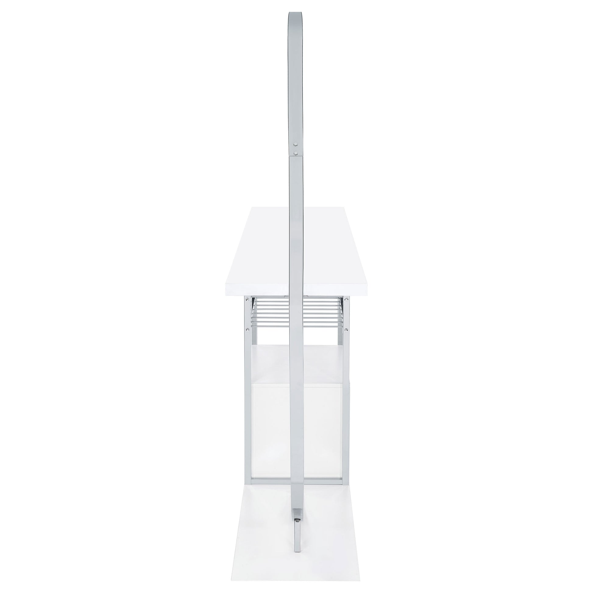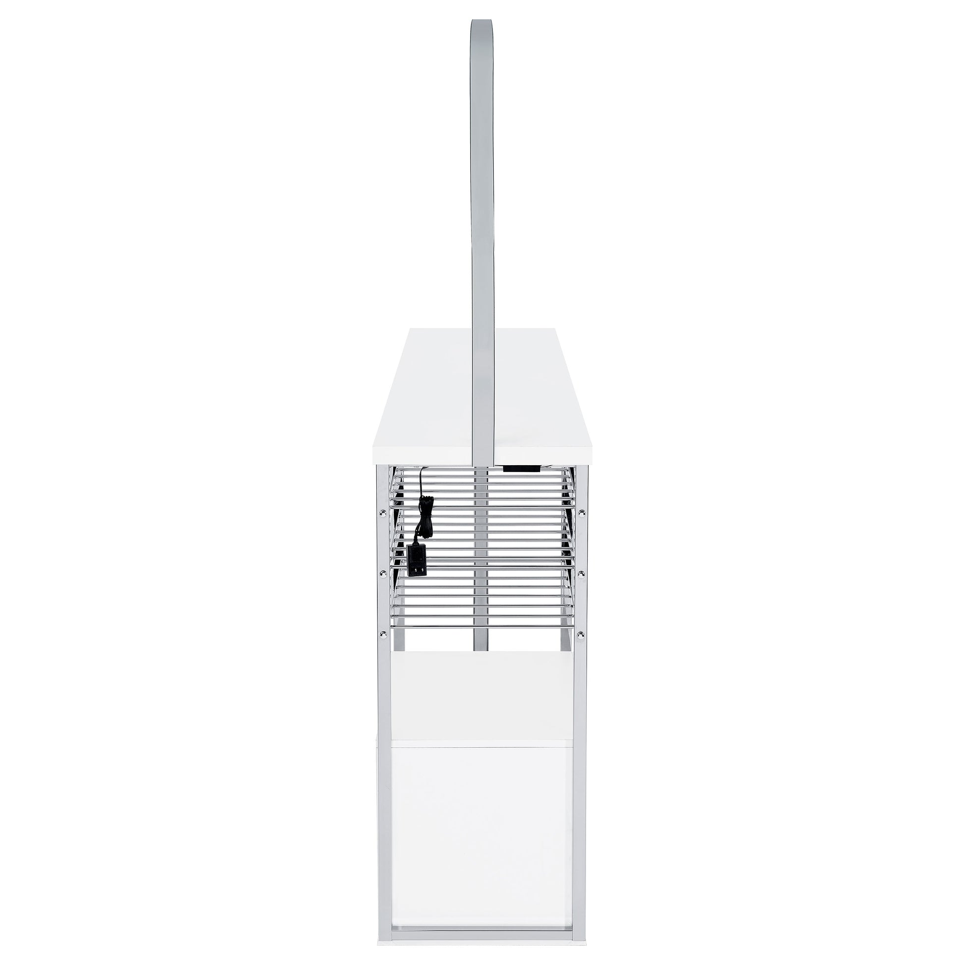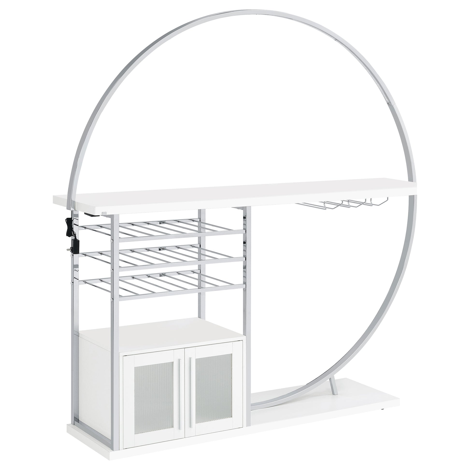Transform your space into a beacon of style with this contemporary wine cabinet that marries function with cutting-edge design. Bathed in the glow of LED lighting with a choice of eight vibrant colors, this piece becomes the centerpiece of any entertainer's haven. The sleek chrome electroplated metal frame supports a durable composite wood tabletop, perfect for hosting an array of glasses and spirits. Below, a two-door cabinet conceals essentials, while three tiers cradle up to 21 bottles of your finest wine. With a built-in stemware rack, this bar doesn't just store your collection, it showcases it, making every occasion a toast-worthy affair.