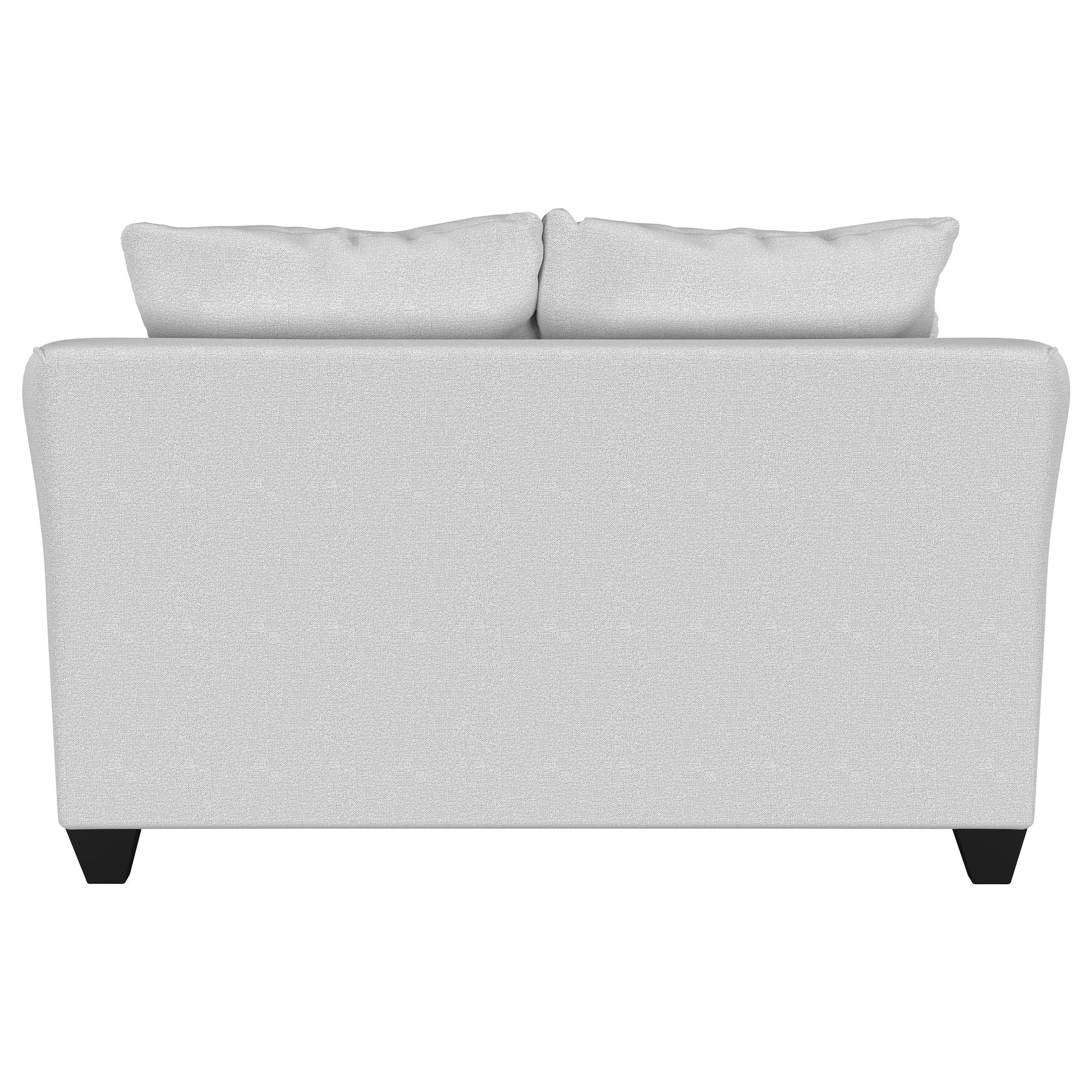 Compact yet elegant, this loveseat delivers lasting comfort in a sleek, timeless form. Its flared arms and structured frame complement both modern and transitional décor. High-density foam cushions promise exceptional support, while tailored upholstery and decorative pillows create a balanced, inviting aesthetic. Designed to fit smaller spaces without sacrificing style, this loveseat provides a refined touch of comfort in any living room setting.