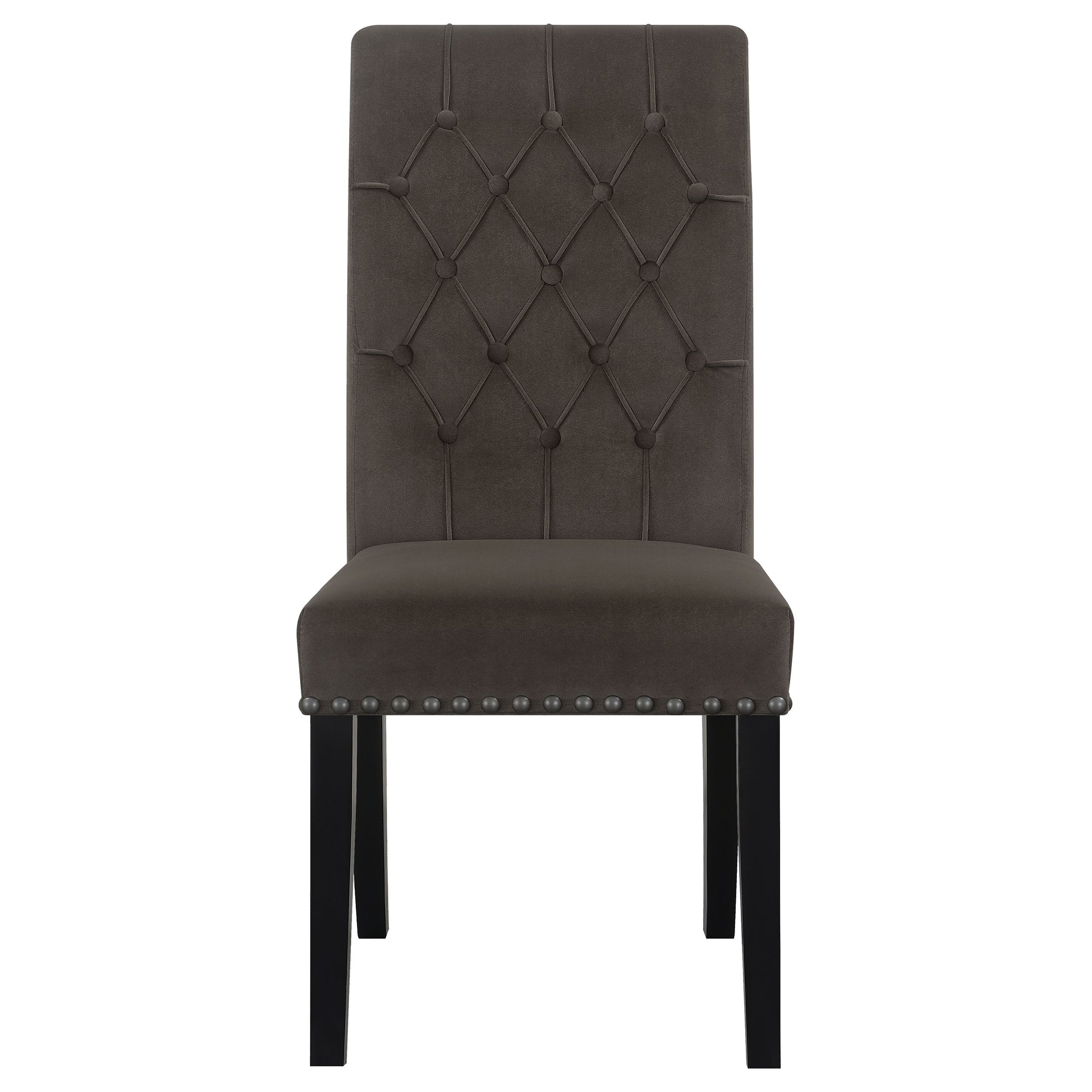 • Plushily padded side chairs are adorned with rolled backs and button-tufted upholstery with bold nailhead trim