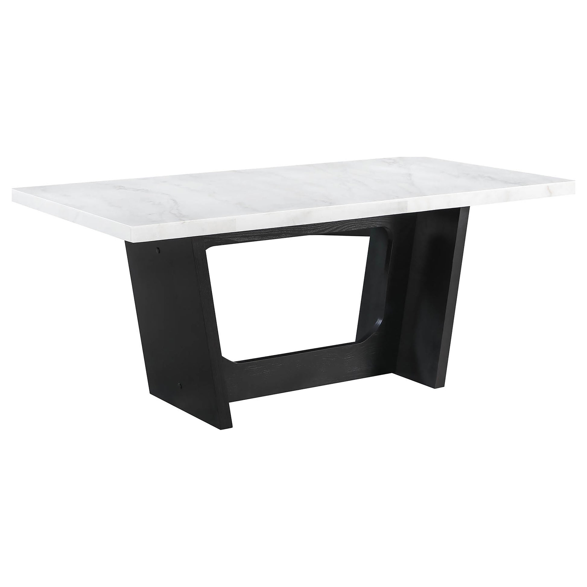Bring together family and friends at this modern rustic style dining table set. The table features a rectangular, thick, white marble top that is spacious enough for six people. Sleek open and airy trestle base with a center punch out, rustic espresso striking color combination lends a dramatic touch and grounds the room elegantly. The set of chairs with a rolled backrest with button-tufted details lends a traditional aesthetic to a space. Also, bringing to your home the classic elements is a padded seat with individual nailhead trim that offers a charming detail.