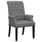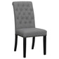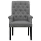 • Plushily padded side chairs are adorned with rolled backs and button-tufted upholstery with bold nailhead trim