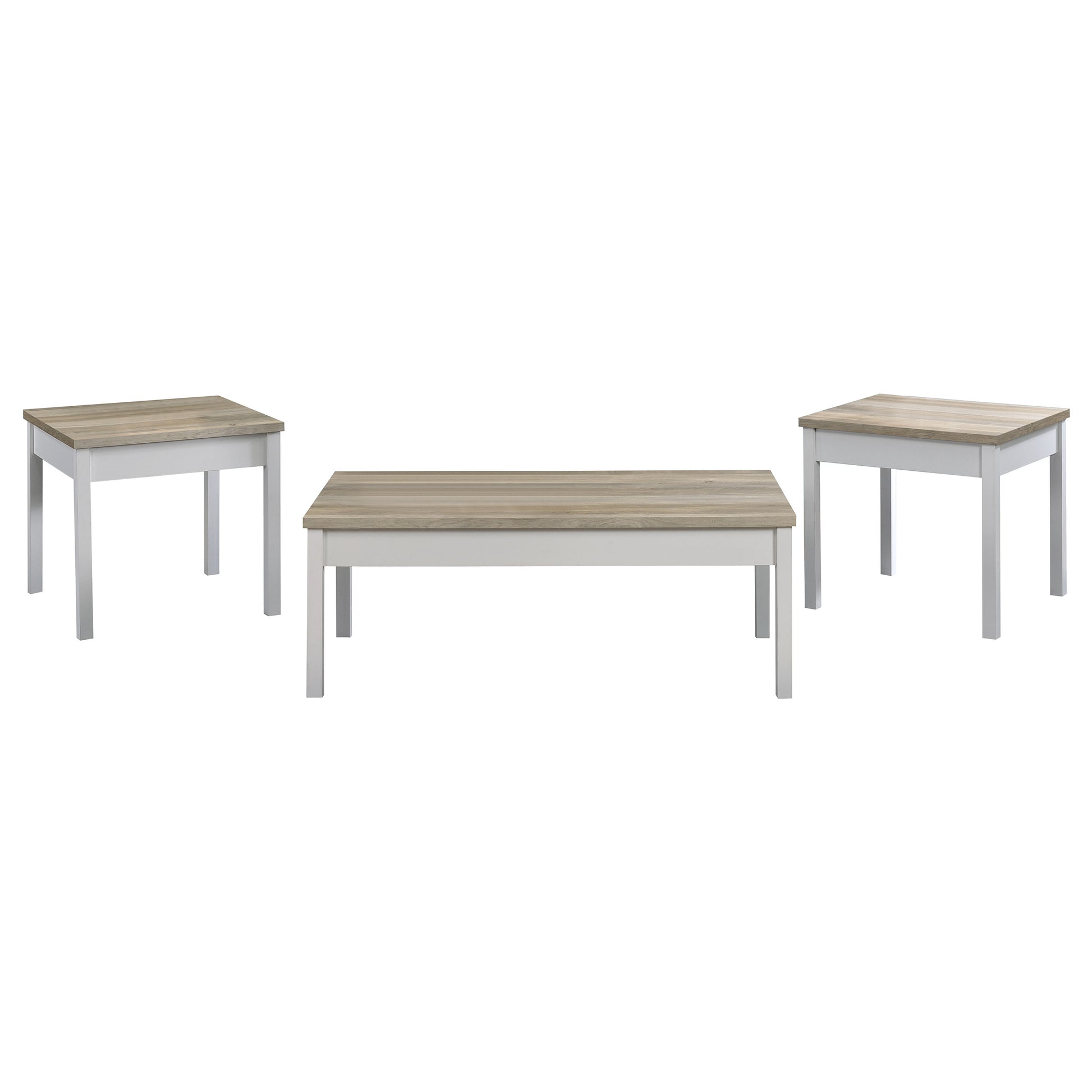 An updated version of farmhouse style is soft and easy on the eyes as this three-piece wood coffee table set is a viable option for your family room or living room. Casual and yet nicely designed, this set offers a versatile finish palette of distressed pine and white over wood products. Clean lines add an easy optical effect. Make your space a simple yet stylish venue with tables designed to last through redesigns. Set includes one rectangular coffee table and two end tables.