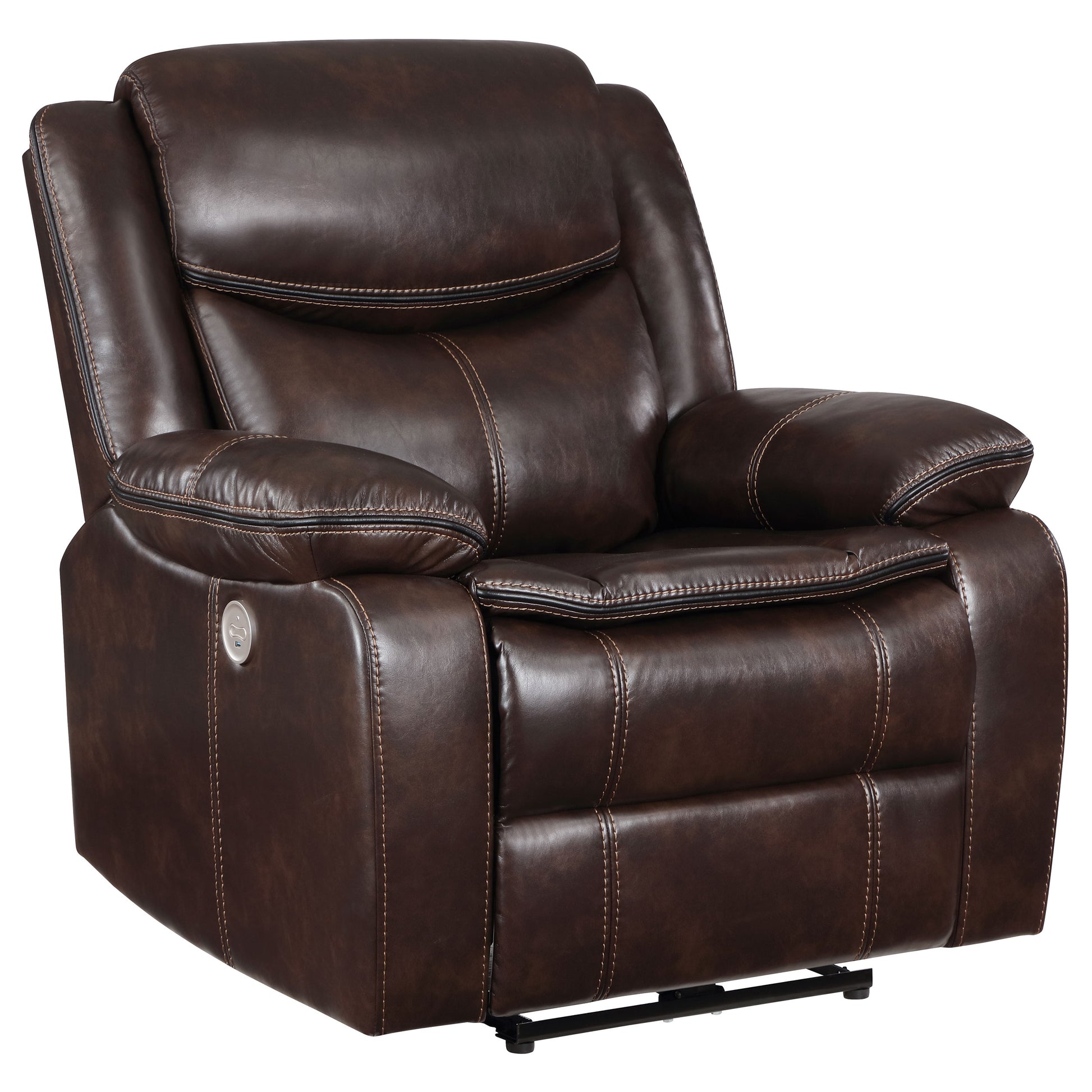 Take relaxation to the next level with a modern power recliner. Smooth, stylish faux leather upholstery sets the tone with accent stitching that creates texture and depth perfect for your living room or den. Plush cushions cradle you in comfort, while contour tufting delivers impressive support. Its dark coloration blends in varied settings, from modern casual living rooms to cozy, classic dens. its control panel includes a built in USB port, perfect for keeping your phone charged while you kick up your feet and relax.